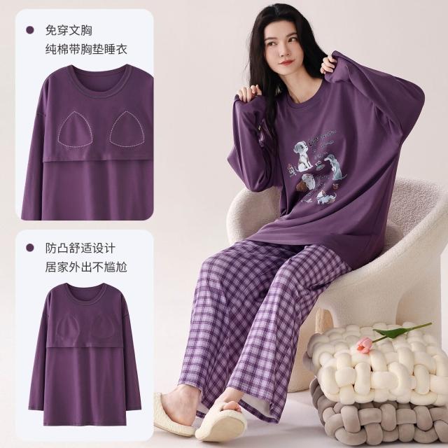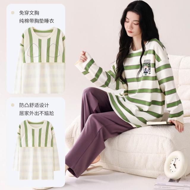 2025秋季新品100%純棉女士睡衣套裝帶胸墊甜美印花舒適可外家居服