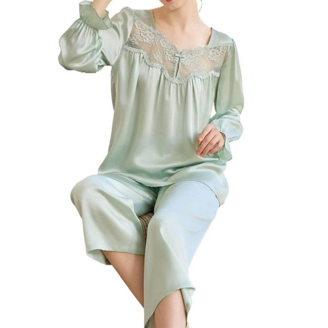 春秋新款真絲睡衣套裝性感蕾絲邊桑蠶絲家居服女士母親節禮物