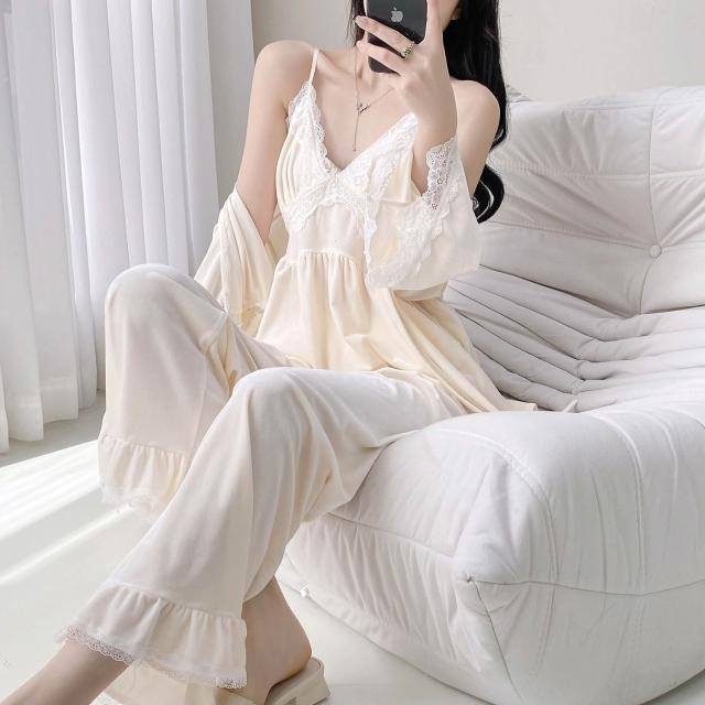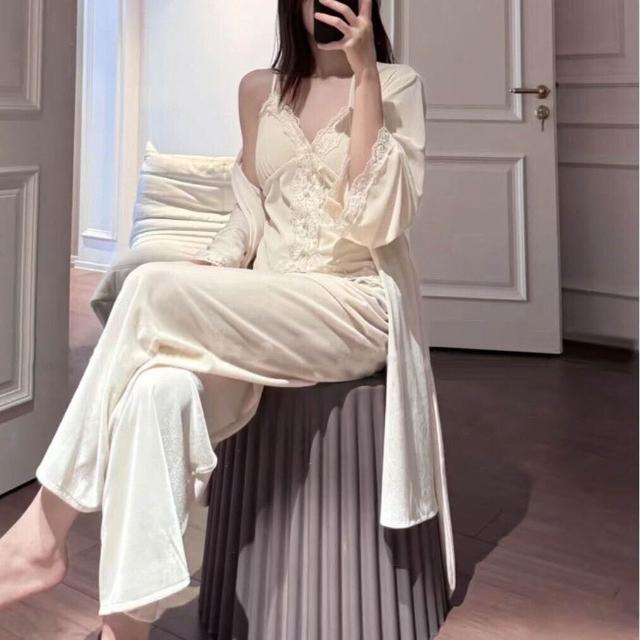金絲絨純欲性感蕾絲吊帶胸墊三件套裝睡衣春秋季舒適家居服睡袍