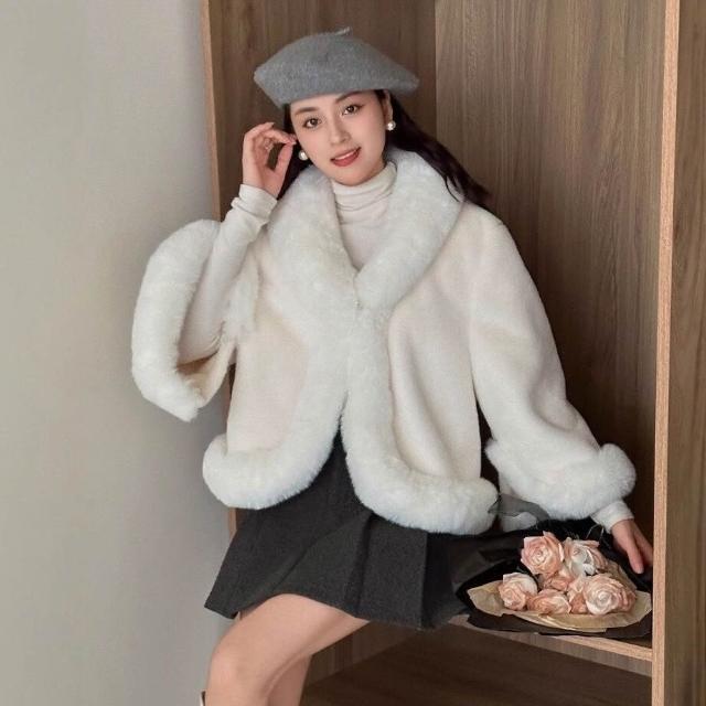 956#秋冬新款加絨加厚兔絨鬥篷披肩女士短款毛領皮草國風毛呢外套