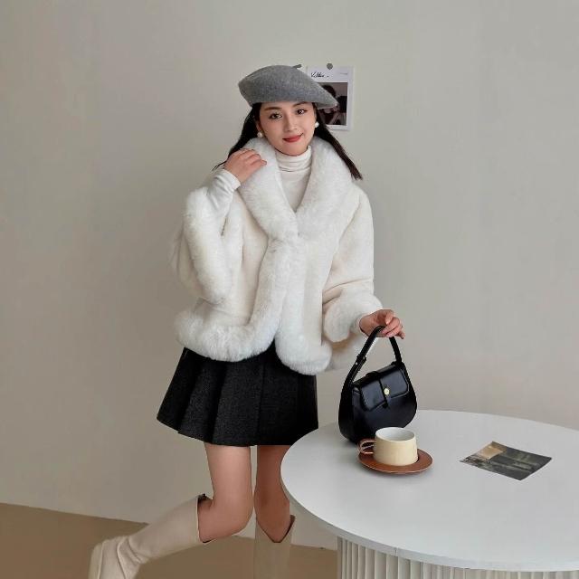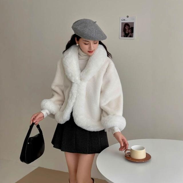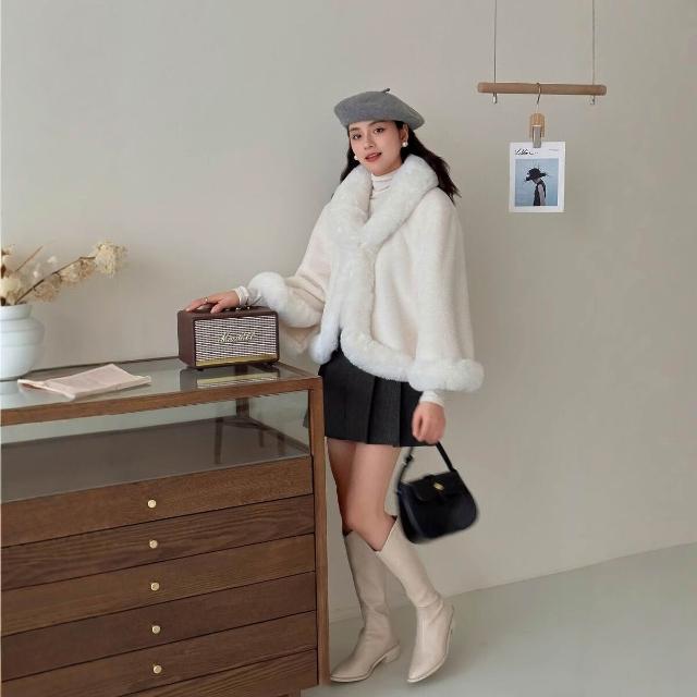 956#秋冬新款加絨加厚兔絨鬥篷披肩女士短款毛領皮草國風毛呢外套