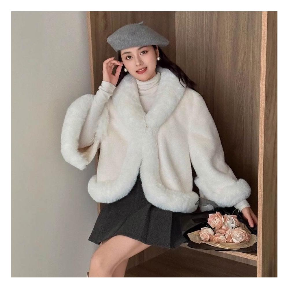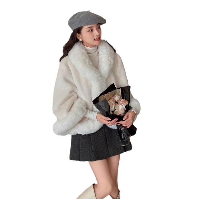 956#秋冬新款加絨加厚兔絨鬥篷披肩女士短款毛領皮草國風毛呢外套