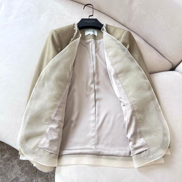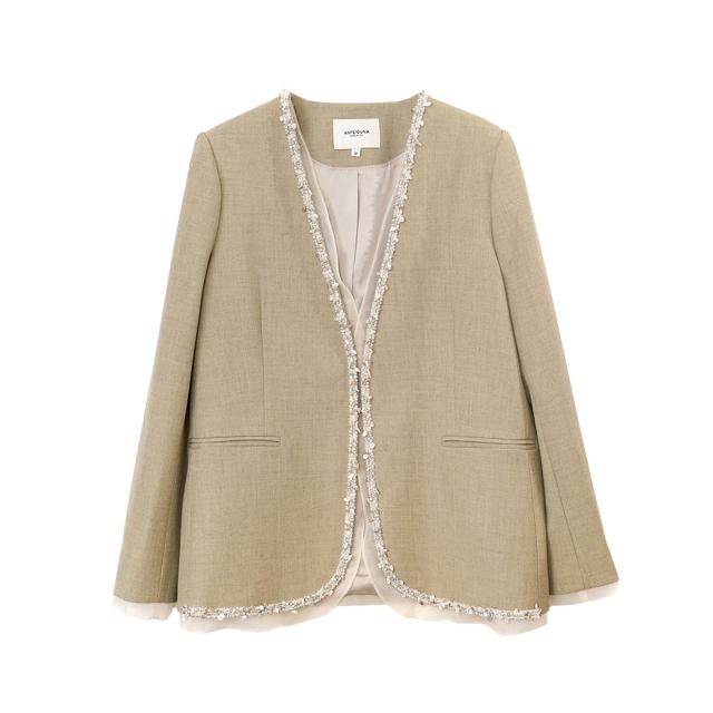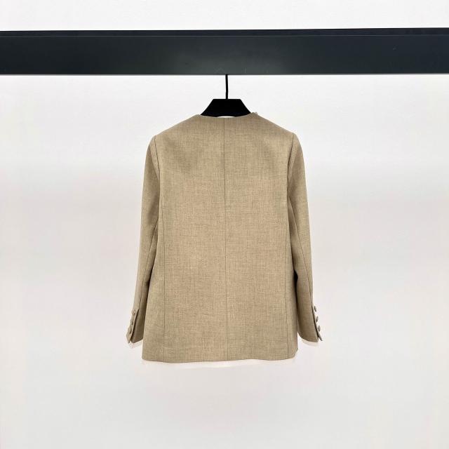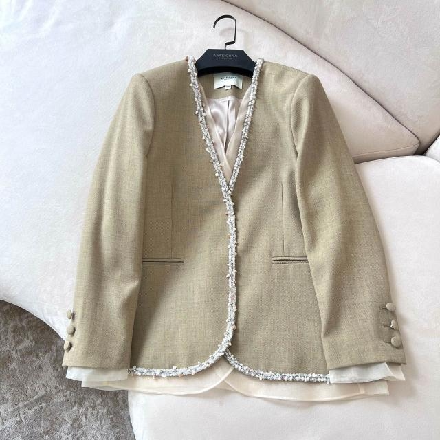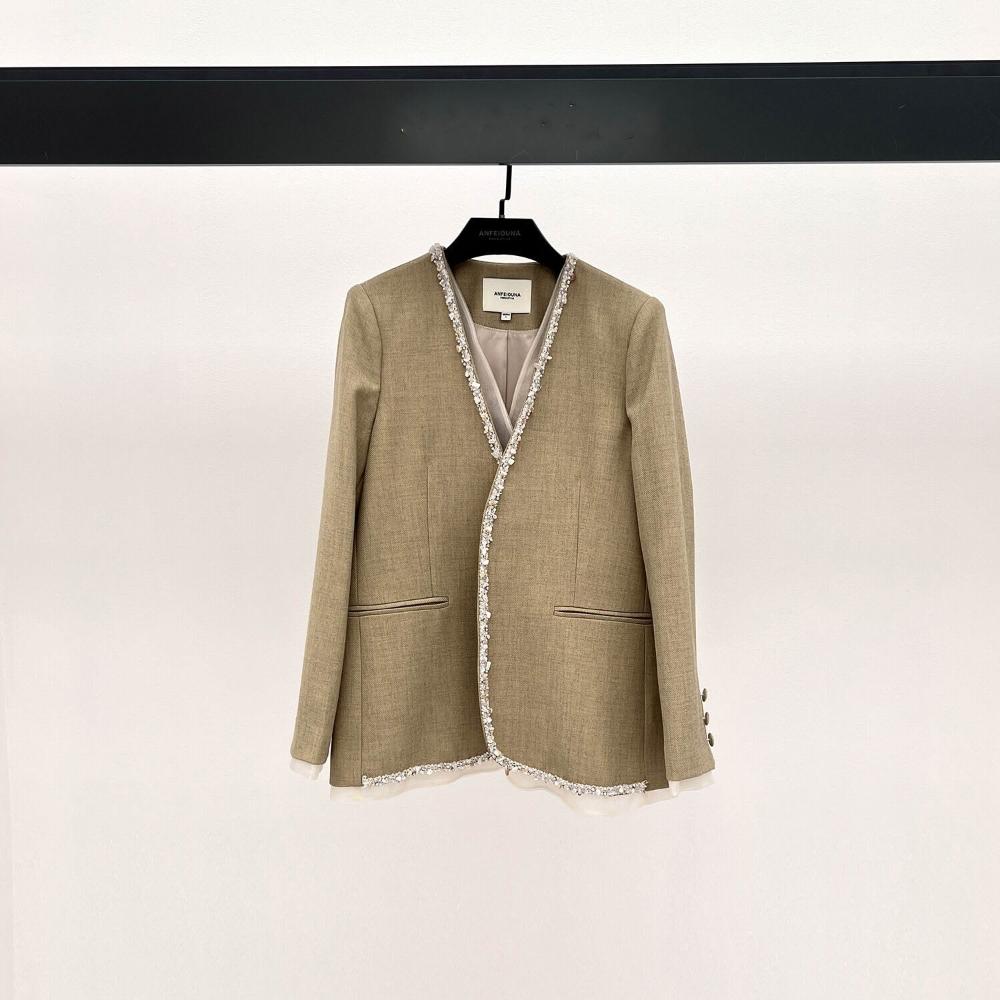 安斐歐娜2025新款無扣V領彈力西服拼接釘鉆珍珠花邊休閑女小西裝