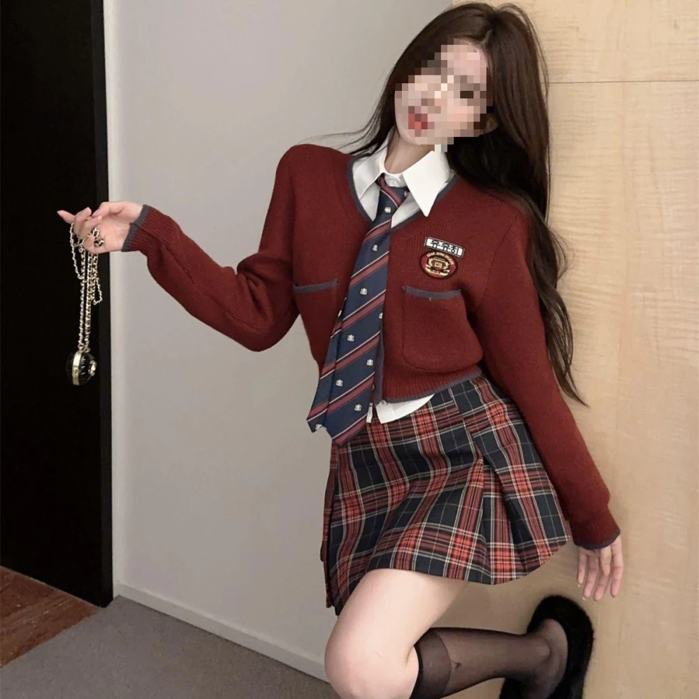 韓系學院風套裝紅色針織開衫毛衣外套長袖領帶襯衫高腰jk格子短裙