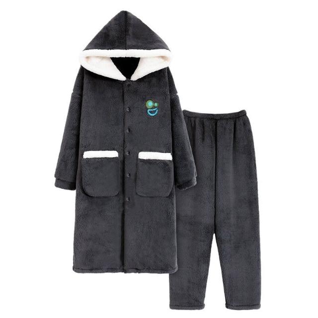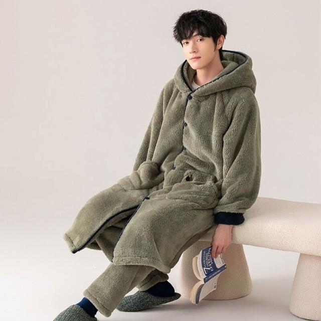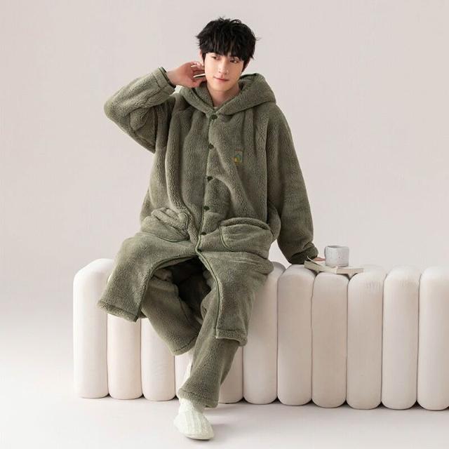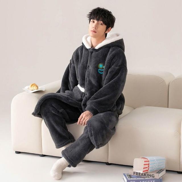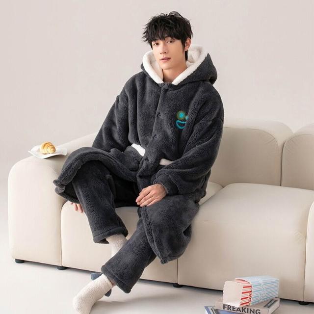 男士睡衣秋冬款加厚加絨珊瑚絨睡袍套裝冬季法蘭絨浴袍簡約家居服