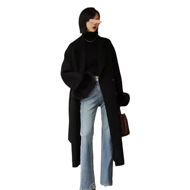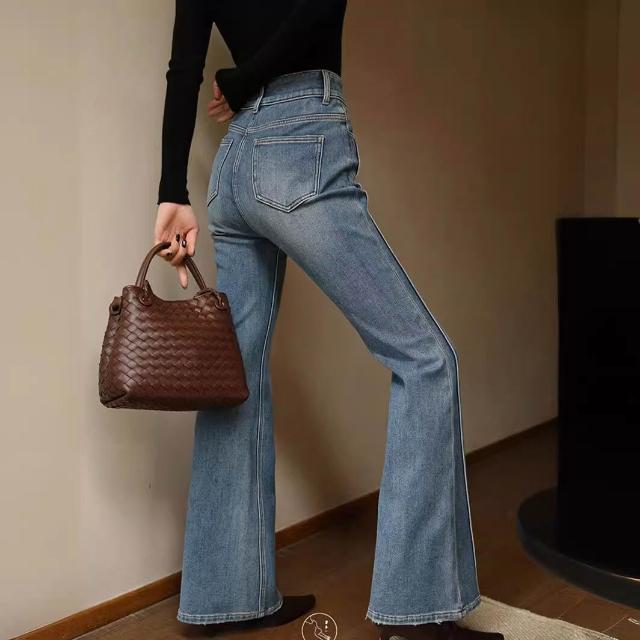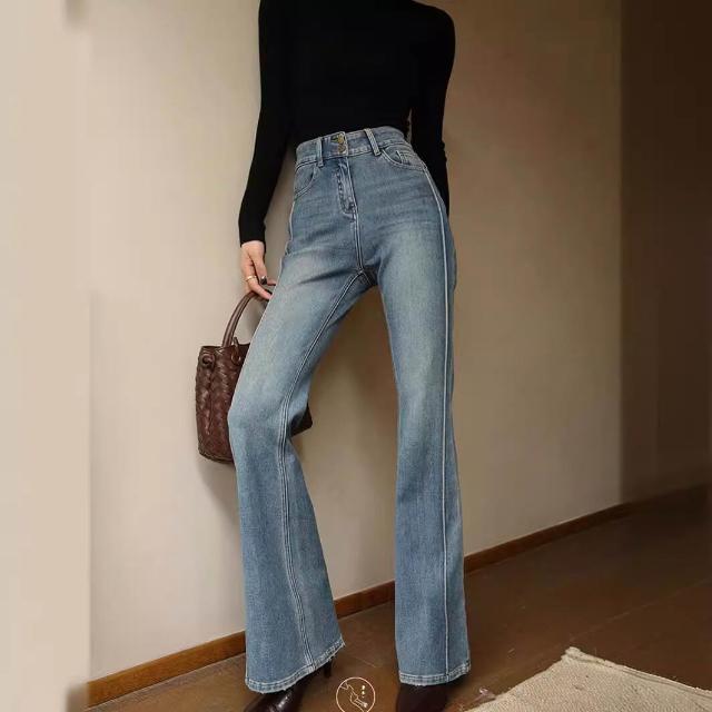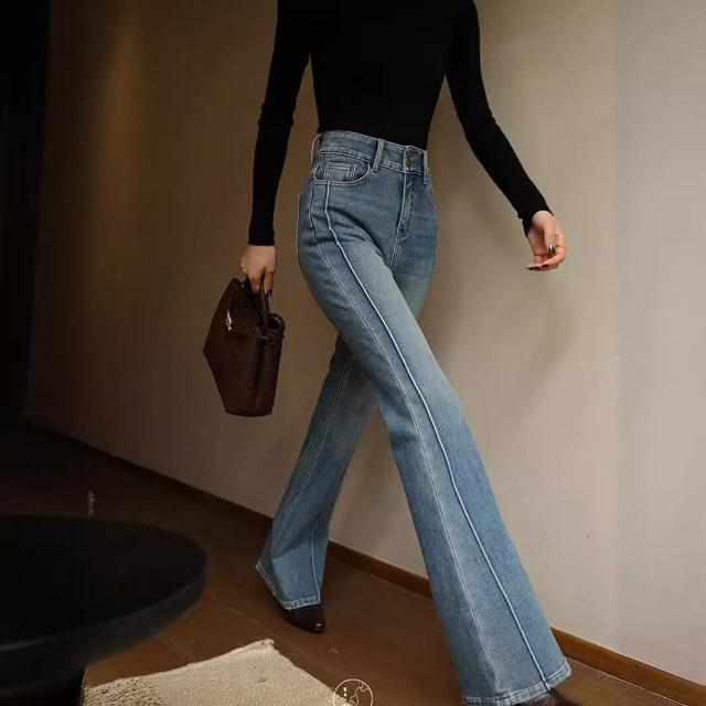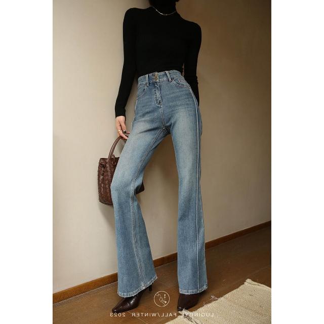 鹭青一碧落直筒牛仔褲女2023春秋新款復古顯瘦高腰微喇褲