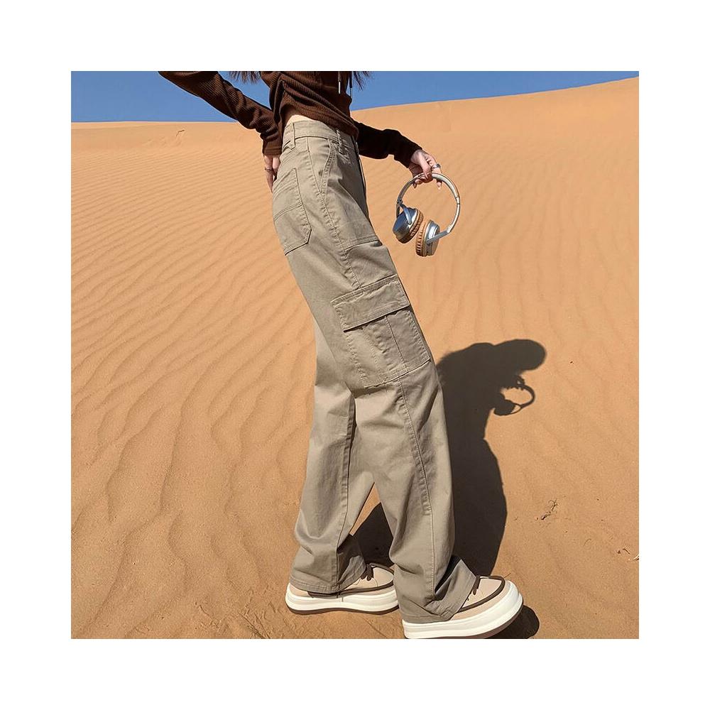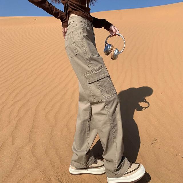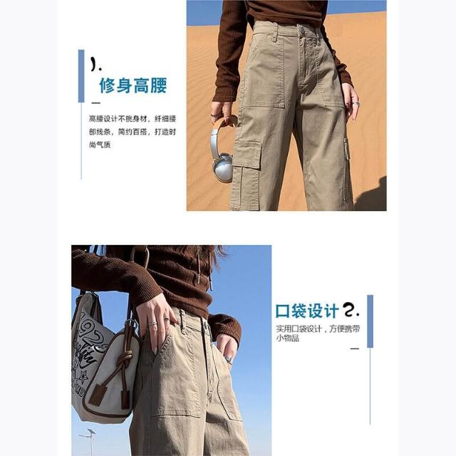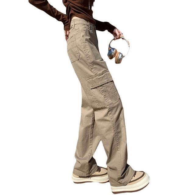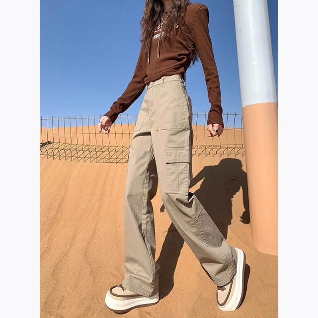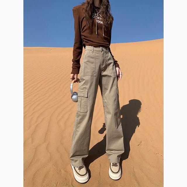 卡其色美式工裝褲女高腰顯瘦直筒春秋新款窄版休閑闊腿牛仔長褲子