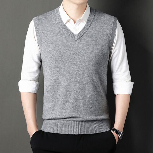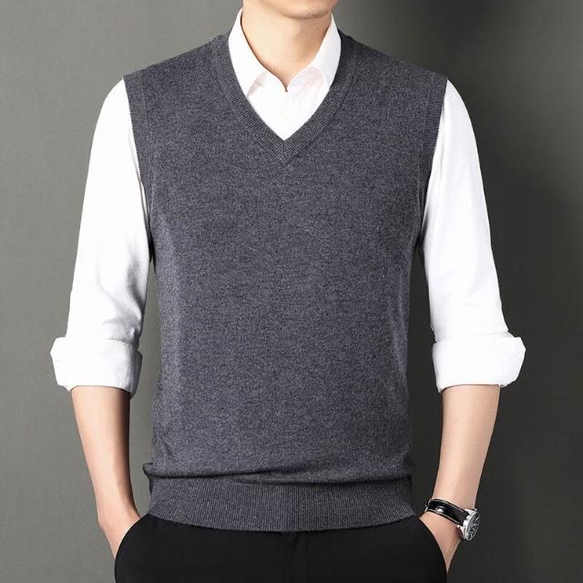 男士100%羊毛背心時尚純色針織男款V領打底衫爸爸裝無袖馬甲毛衣