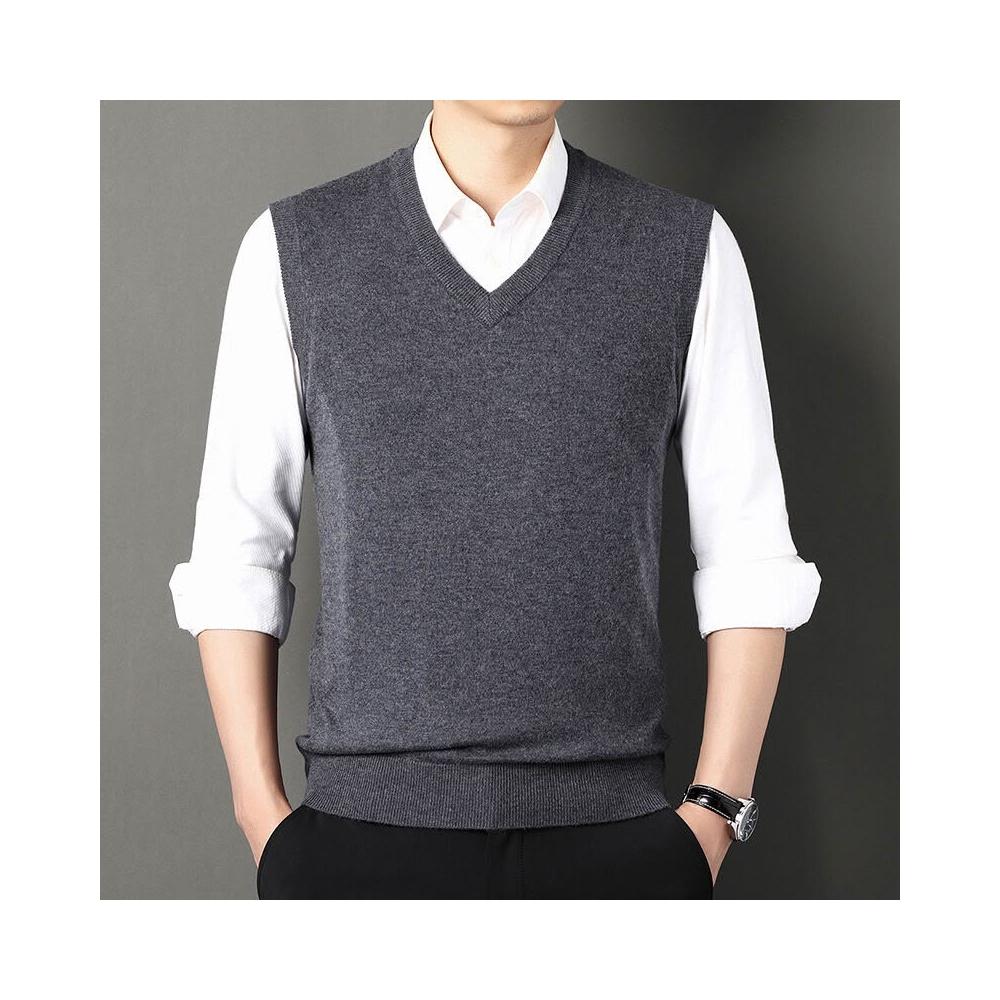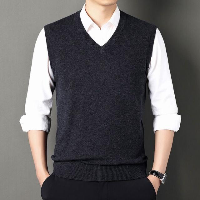 男士100%羊毛背心時尚純色針織男款V領打底衫爸爸裝無袖馬甲毛衣