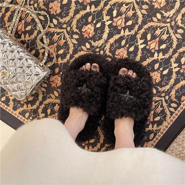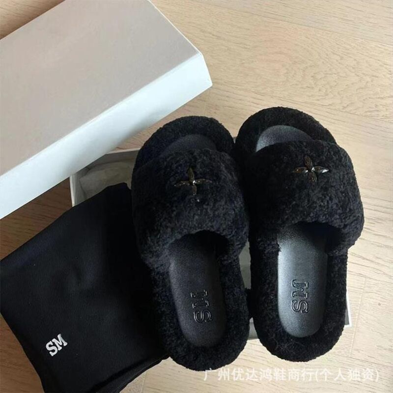 純原SMFK輕奢風十字徽章毛鞋女秋冬外穿皮拖洋氣厚底露趾休閑拖鞋