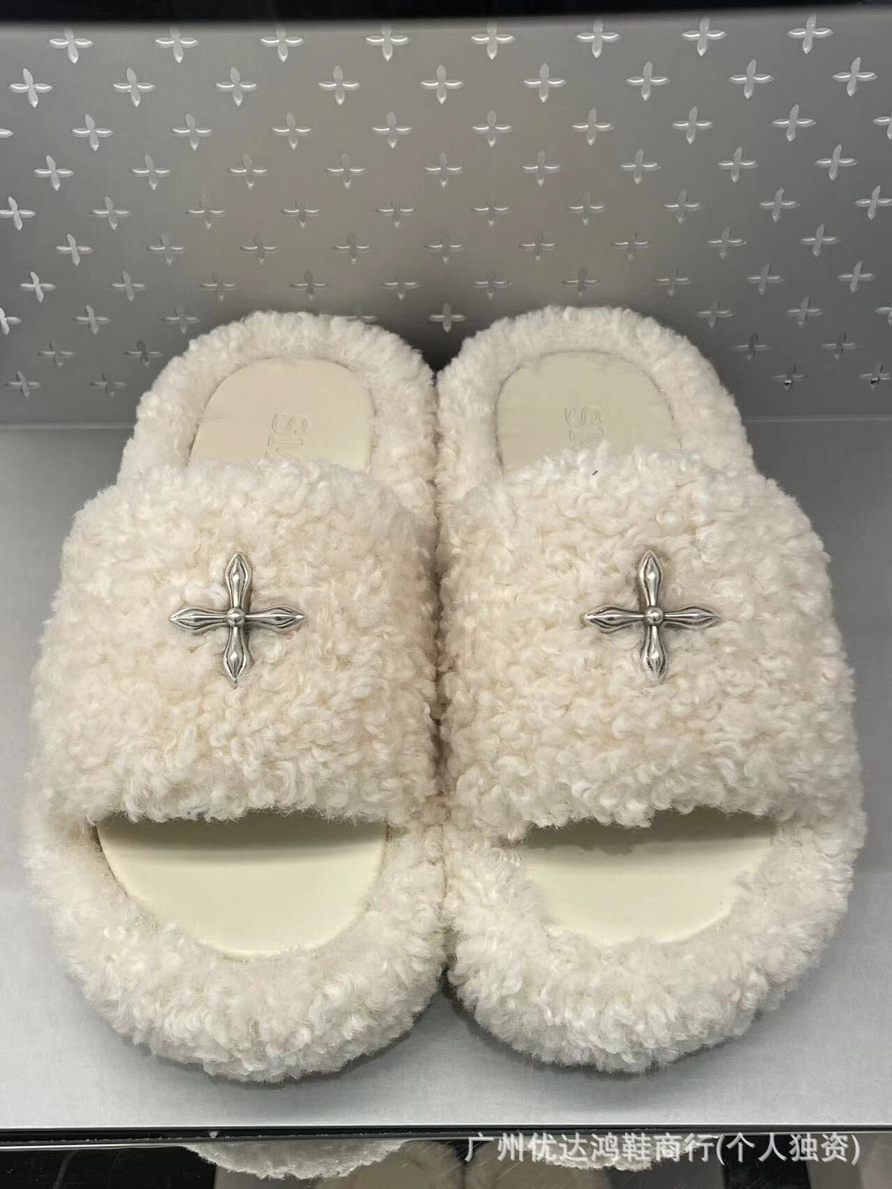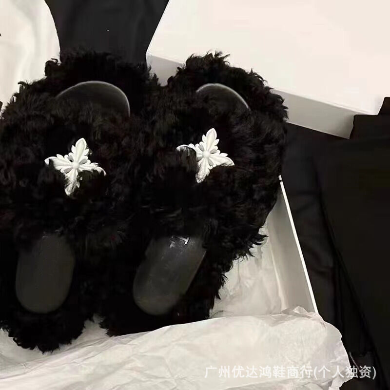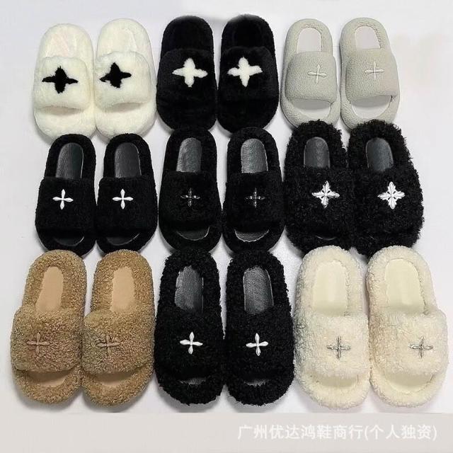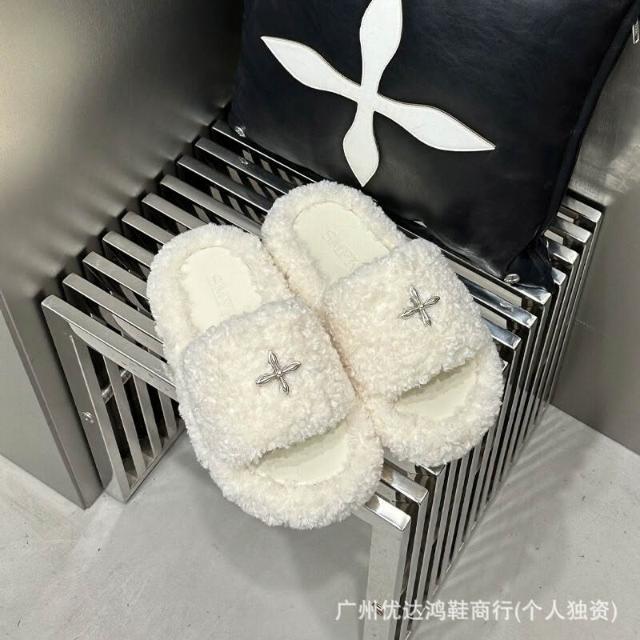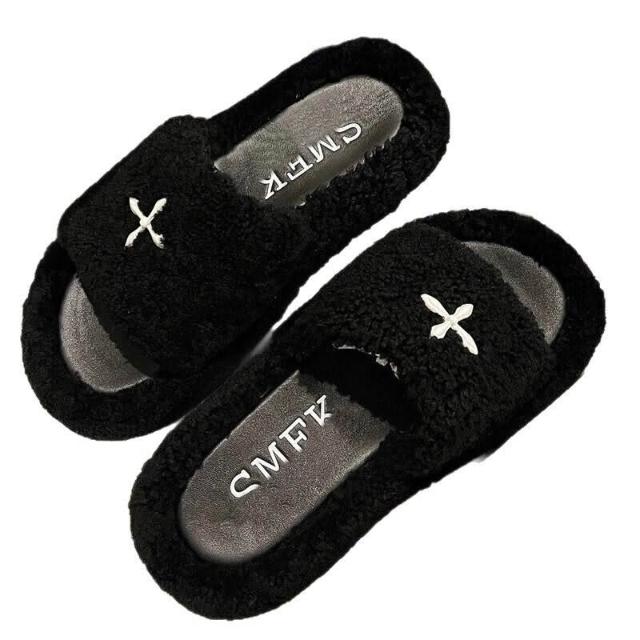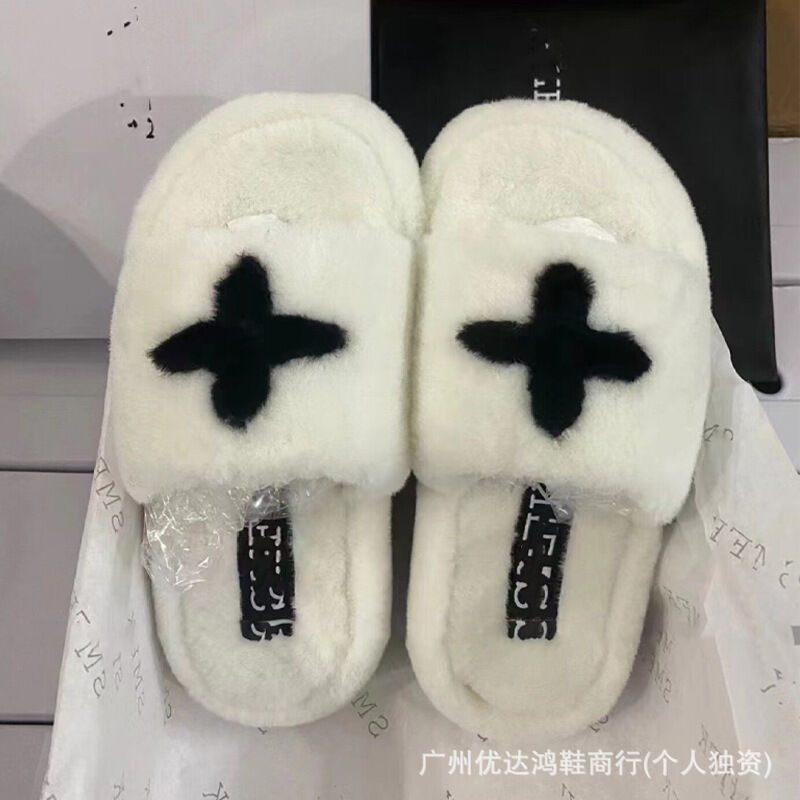 純原SMFK輕奢風十字徽章毛鞋女秋冬外穿皮拖洋氣厚底露趾休閑拖鞋