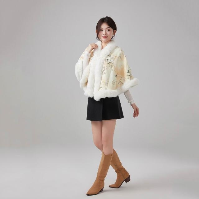 新款國風加絨仿獺兔毛絨領披肩鬥篷旗袍新中式外搭披風保暖外套女