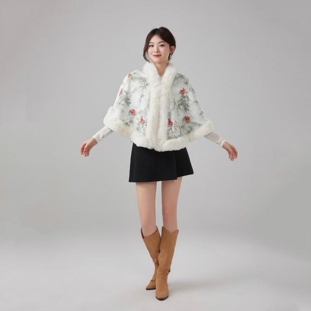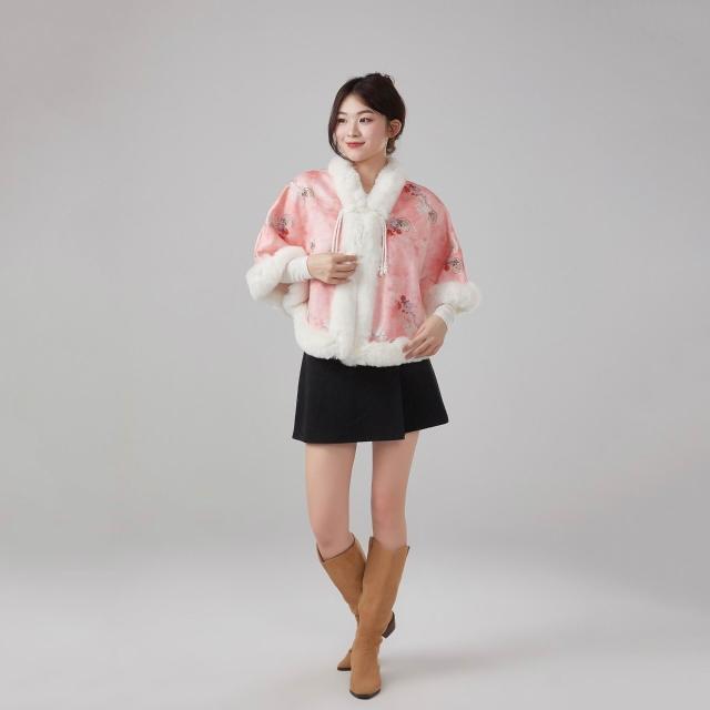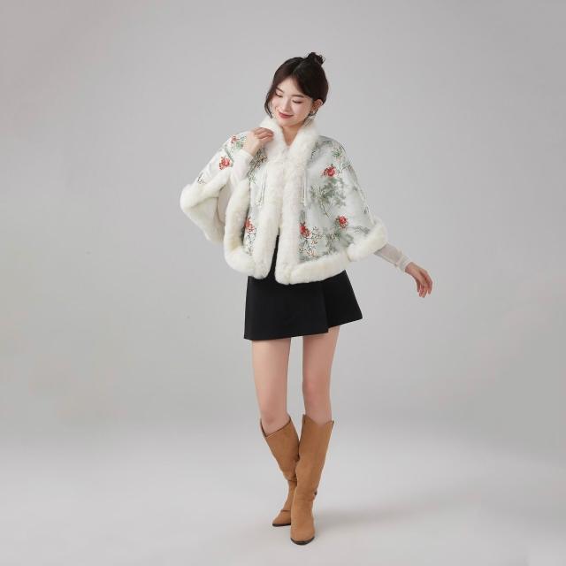 新款國風加絨仿獺兔毛絨領披肩鬥篷旗袍新中式外搭披風保暖外套女