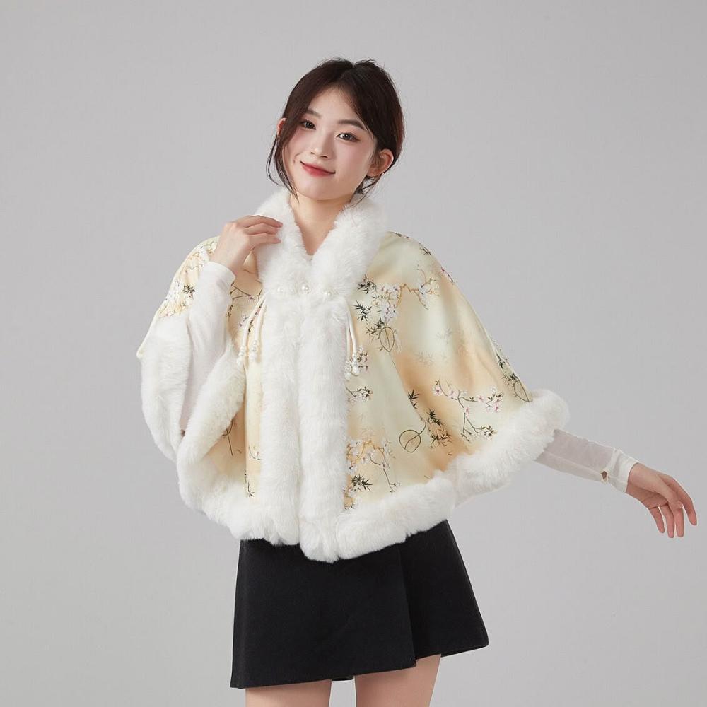 新款國風加絨仿獺兔毛絨領披肩鬥篷旗袍新中式外搭披風保暖外套女