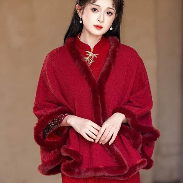 紅色披肩搭配旗袍女外搭秋冬敬酒服新娘結婚訂婚禮服外套百搭鬥篷