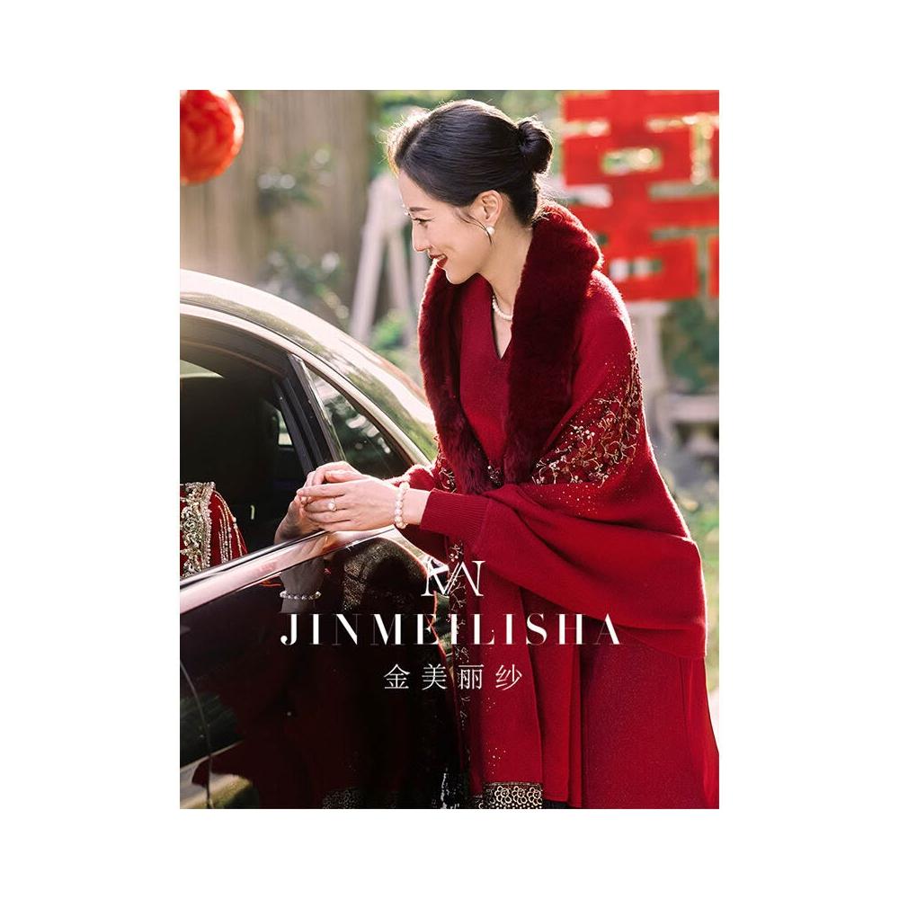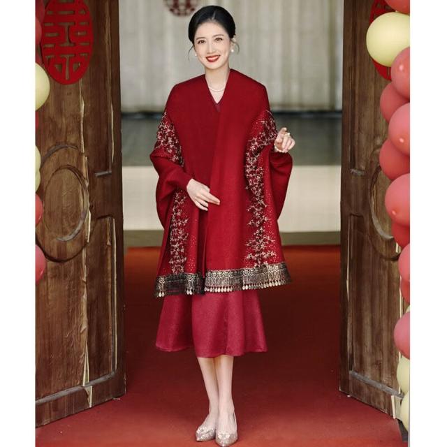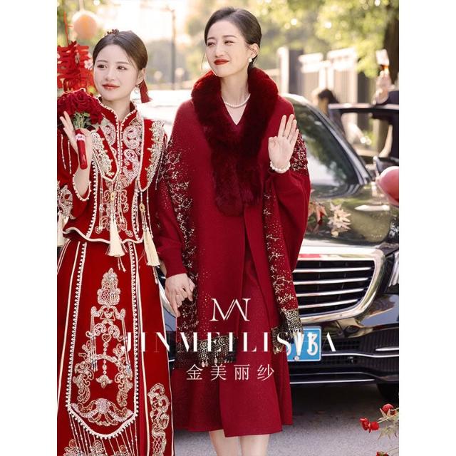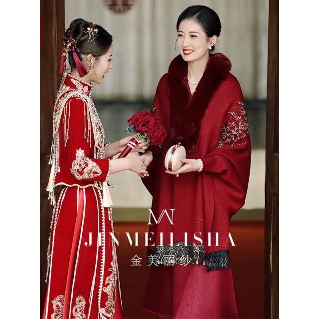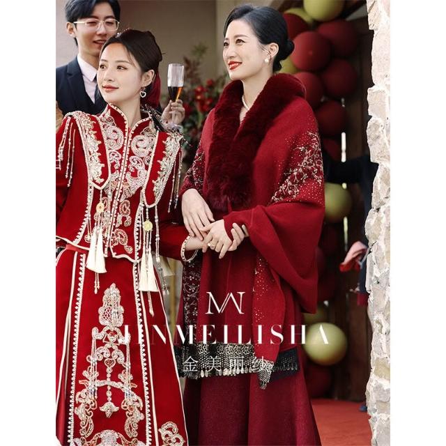 婚宴媽媽禮服披肩酒紅色冬季加毛加厚保暖長袖中式鬥篷披風喜婆婆