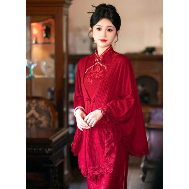 紅色披肩搭配旗袍敬酒服新娘外搭針織開衫外套遮肉顯瘦中國風喜慶