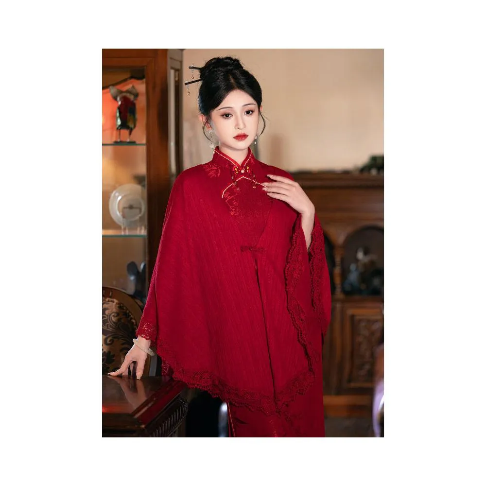 紅色披肩搭配旗袍敬酒服新娘外搭針織開衫外套遮肉顯瘦中國風喜慶