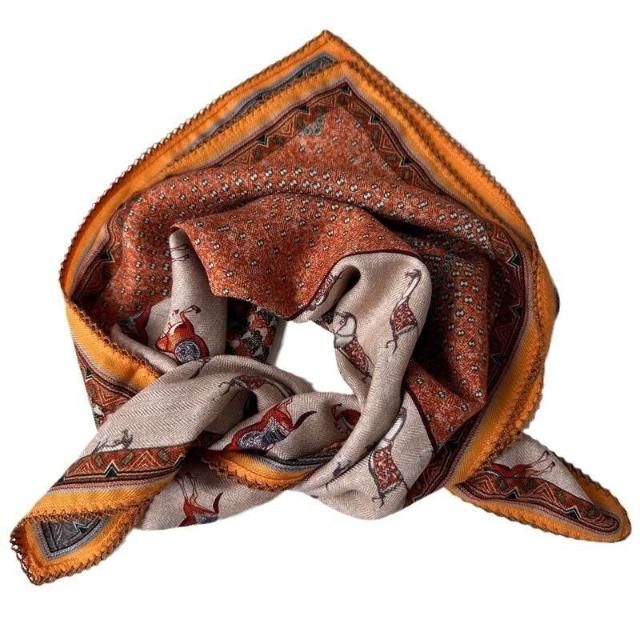 法國小馬圖騰橙色真絲羊絨圍巾多用小方巾領巾高檔送禮媽媽絲巾女