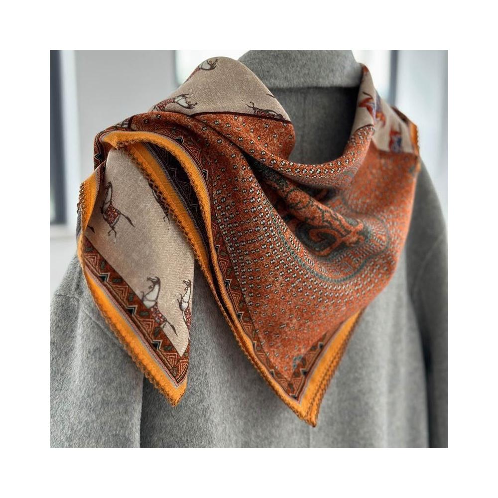 法國小馬圖騰橙色真絲羊絨圍巾多用小方巾領巾高檔送禮媽媽絲巾女