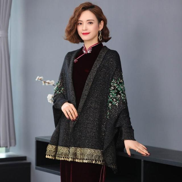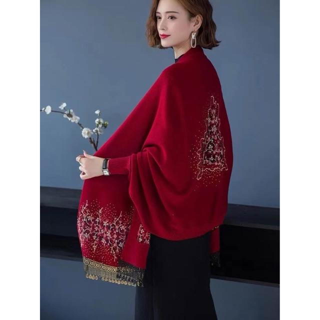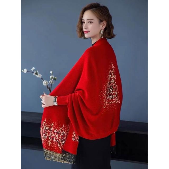 秋冬新款圍巾披肩旗袍披肩女百搭外套高端喜婆婆披風繡花流蘇針織