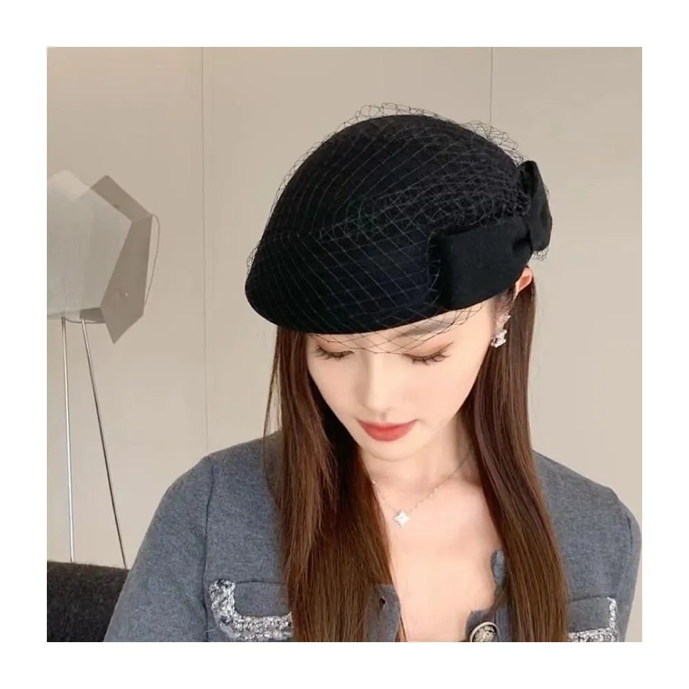 法式網紗蝴蝶結貝雷帽子女秋冬澳洲羊毛呢氈帽英倫禮帽復古空姐帽