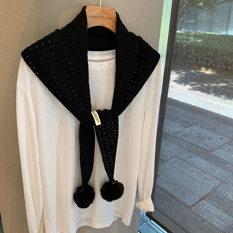 韓系羊毛镂空掛毛球圍巾設計師款三角巾搭肩披肩疊穿裝飾可愛坎肩