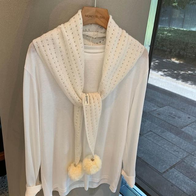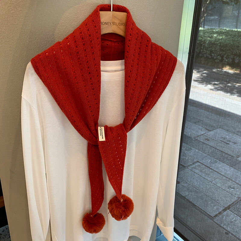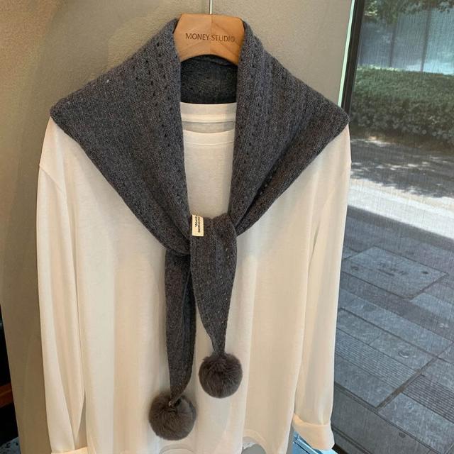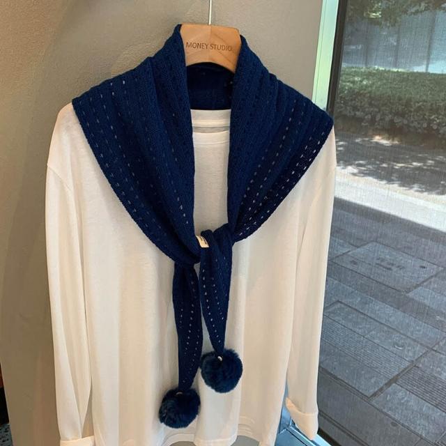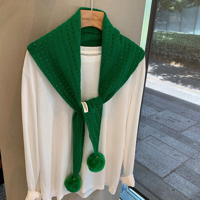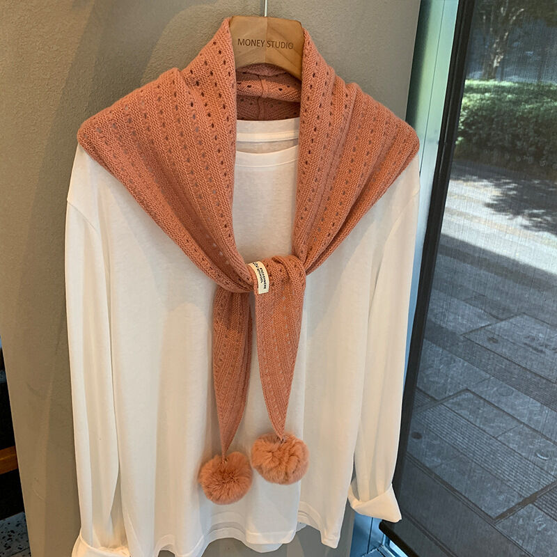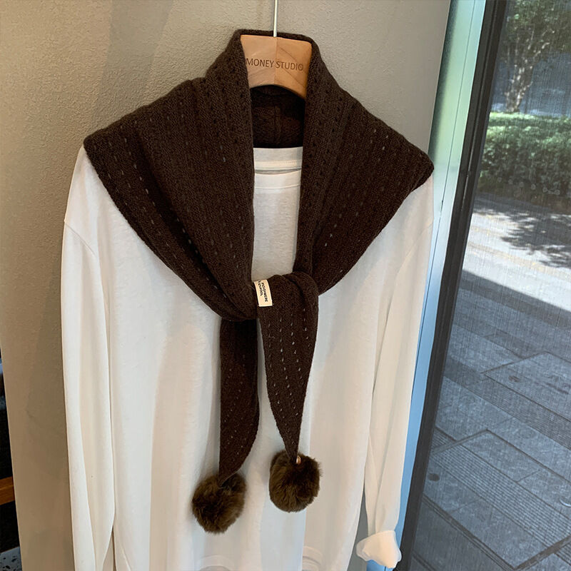韓系羊毛镂空掛毛球圍巾設計師款三角巾搭肩披肩疊穿裝飾可愛坎肩