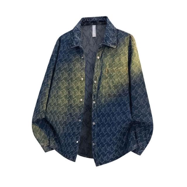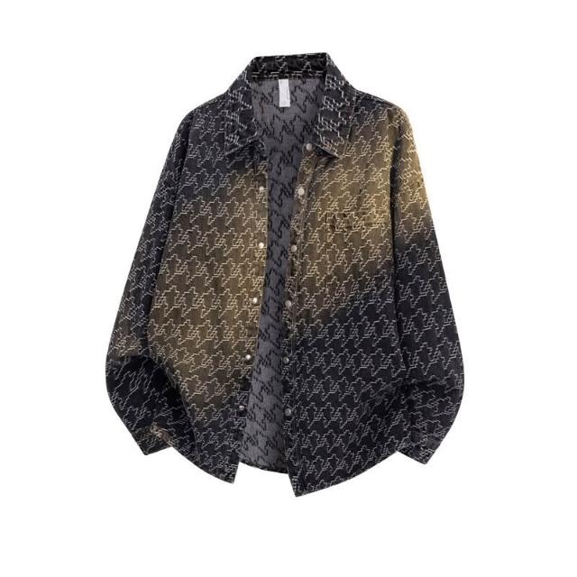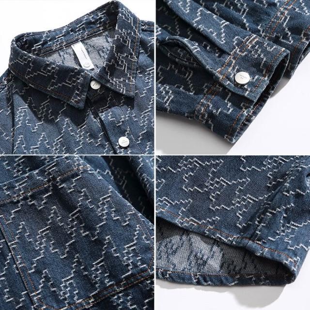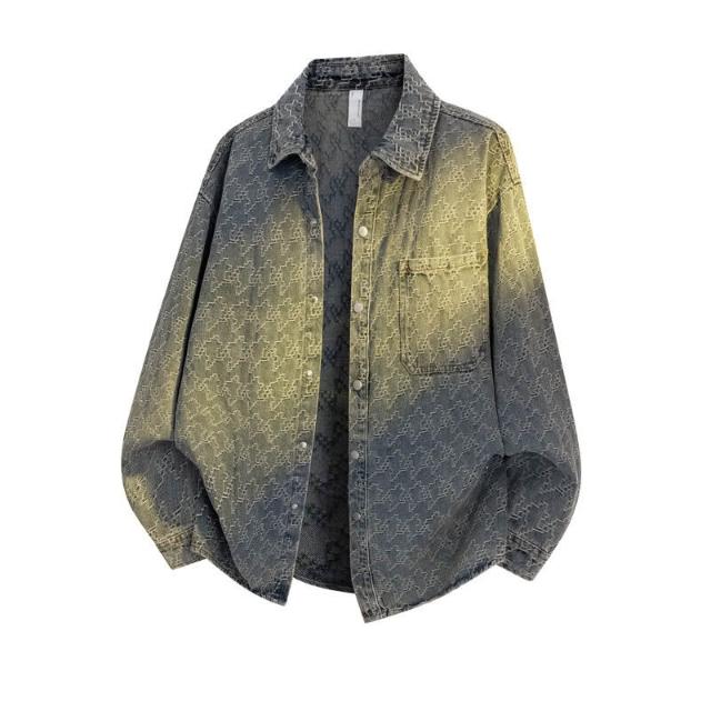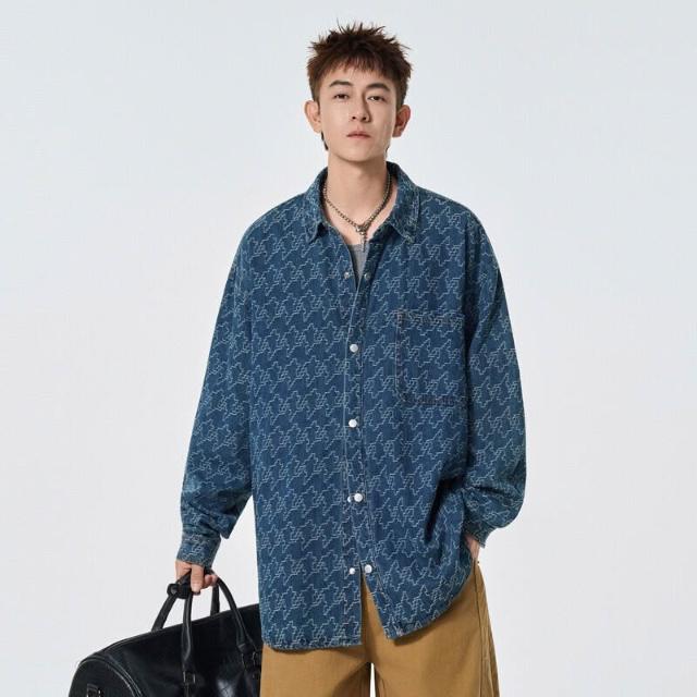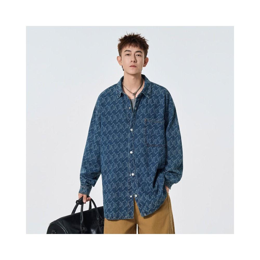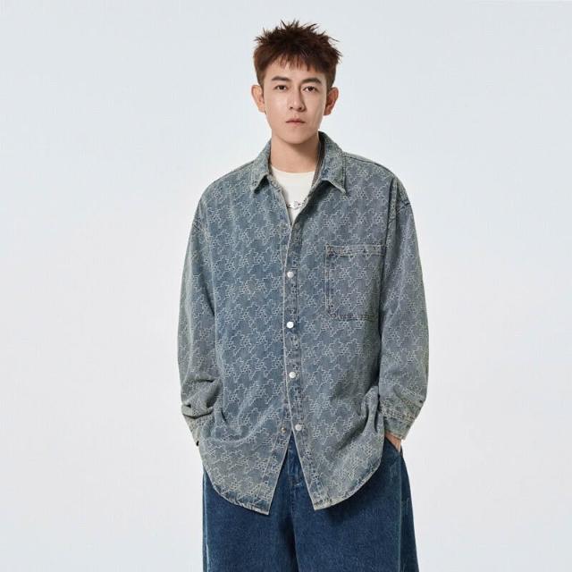 ACU男裝|滿版提花牛仔外套男士2025長袖襯衫美式潮牌寬松工裝上衣
