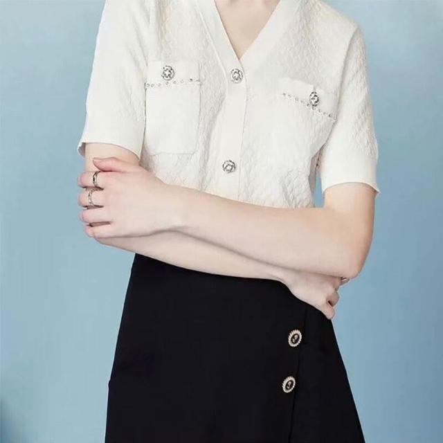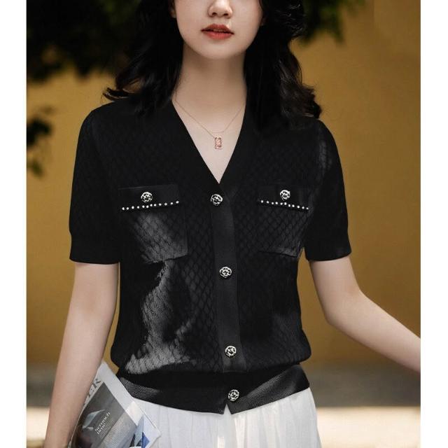 小香風v領短袖黑色針織衫女2025年夏季新款時尚洋氣寬松顯瘦上衣
