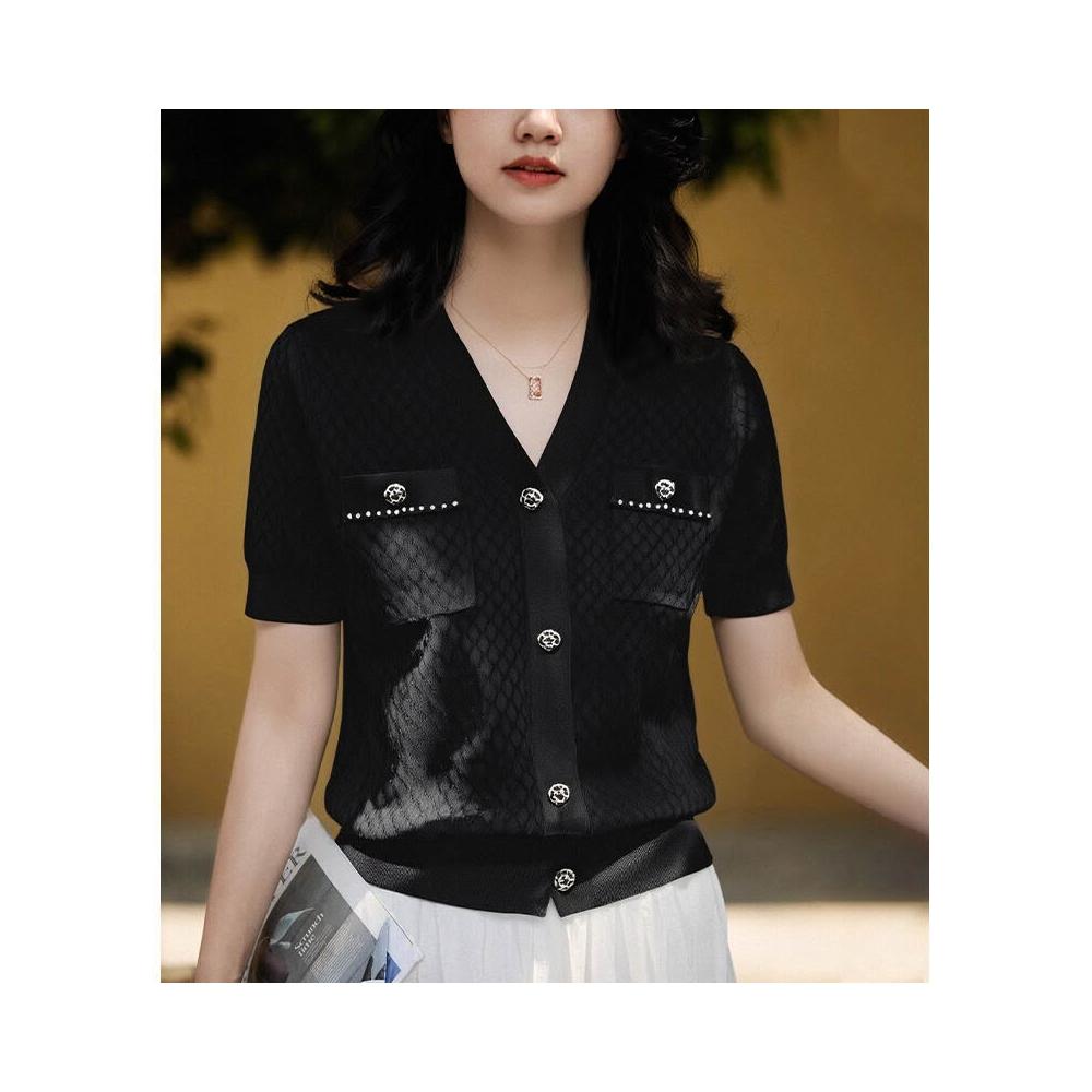 小香風v領短袖黑色針織衫女2025年夏季新款時尚洋氣寬松顯瘦上衣