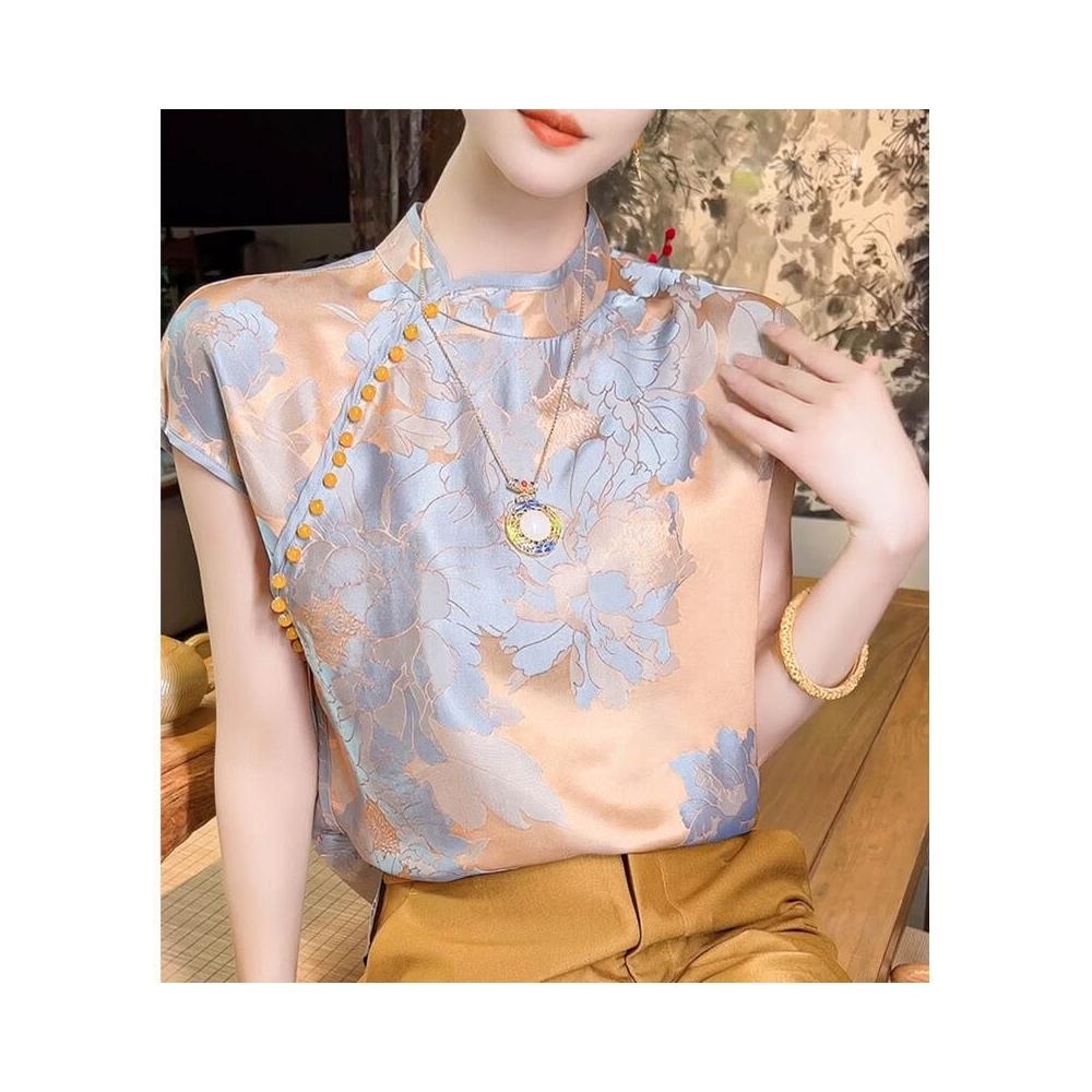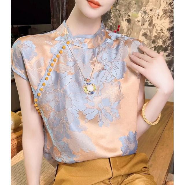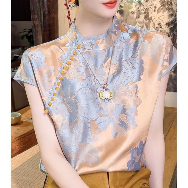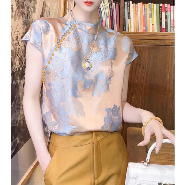山茶花新中式女裝 輕國風香雲紗短袖 上衣女夏 真絲襯衫 短袖 真絲短袖