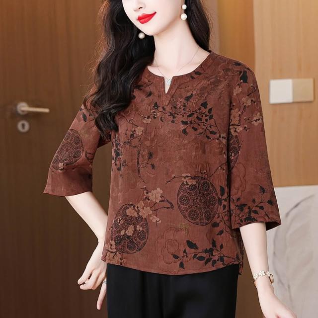 夏季短袖 T恤 新款上架 新中式真絲香雲紗上衣女高端桑蠶絲七分袖小衫寬松大碼氣質媽媽裝 初禾精品