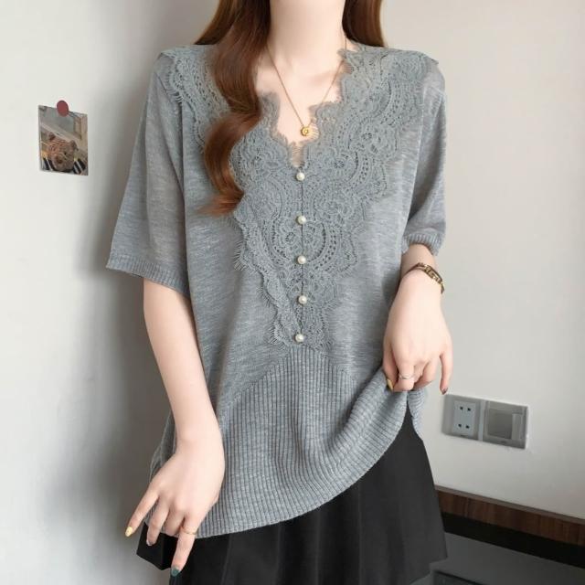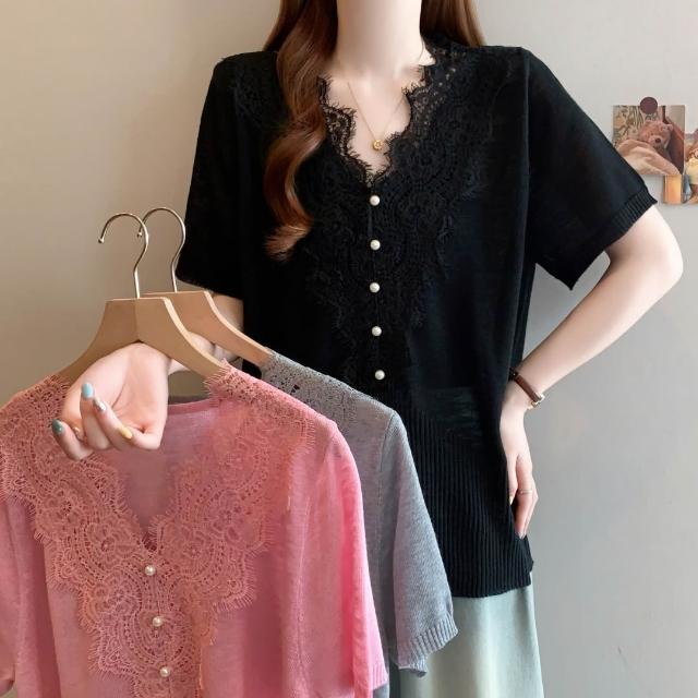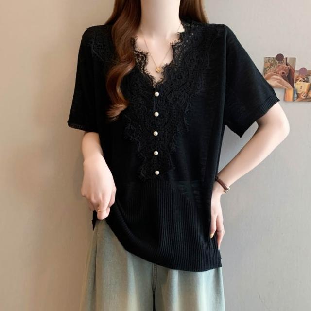 夏季短袖 T恤 新款上架 檔口實拍26年夏季新款大碼韓系鉤花蕾絲花邊短袖V領針織短袖T恤 初禾精品