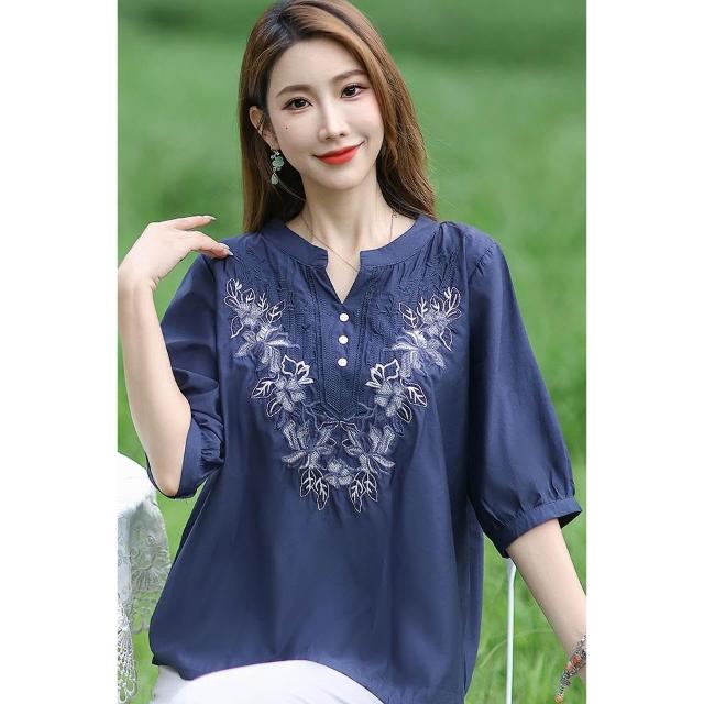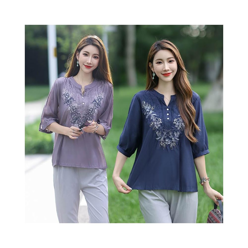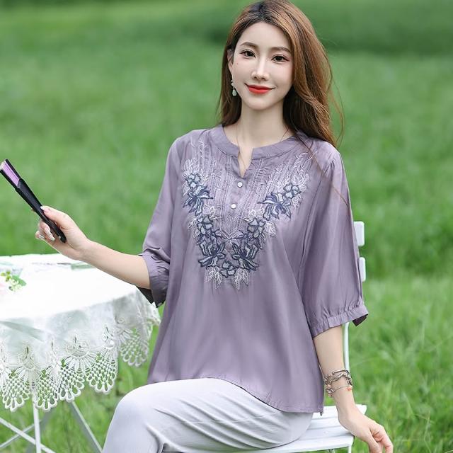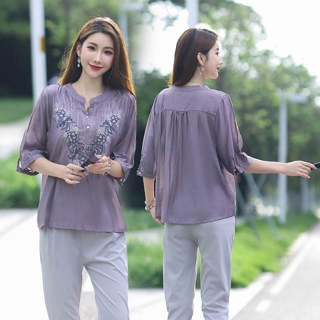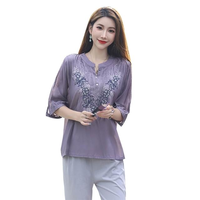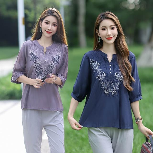 夏季短袖 T恤 新款上架 棉麻亞麻上衣女士高端棉綢中袖七分袖中年媽媽洋氣夏季裝短袖t恤 初禾精品