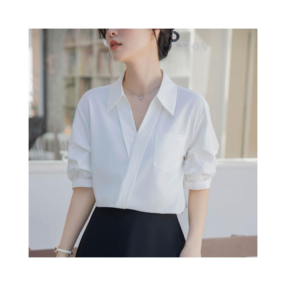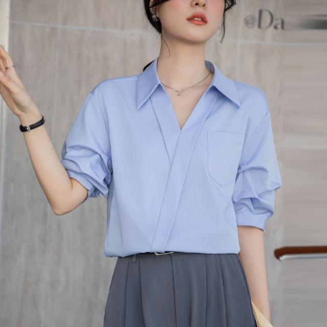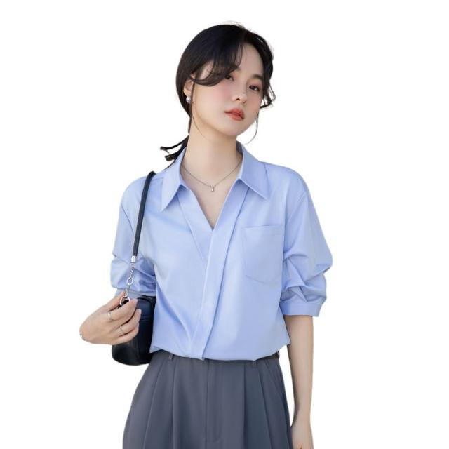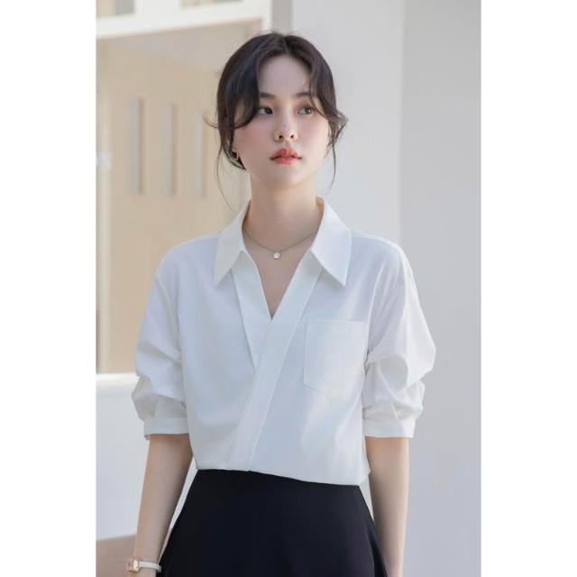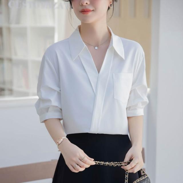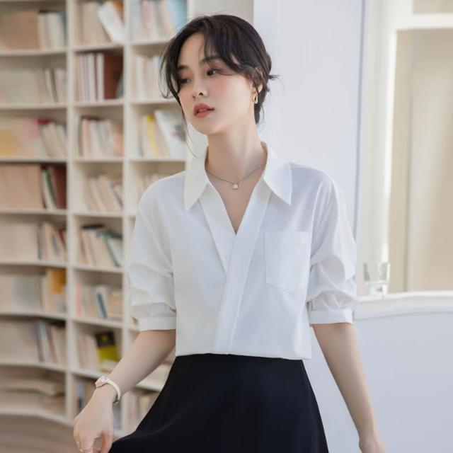 夏季短袖 T恤 新款上架 白色襯衫女2025夏季新款休閑寬松職業法式小眾上衣V領短袖襯衣 初禾精品
