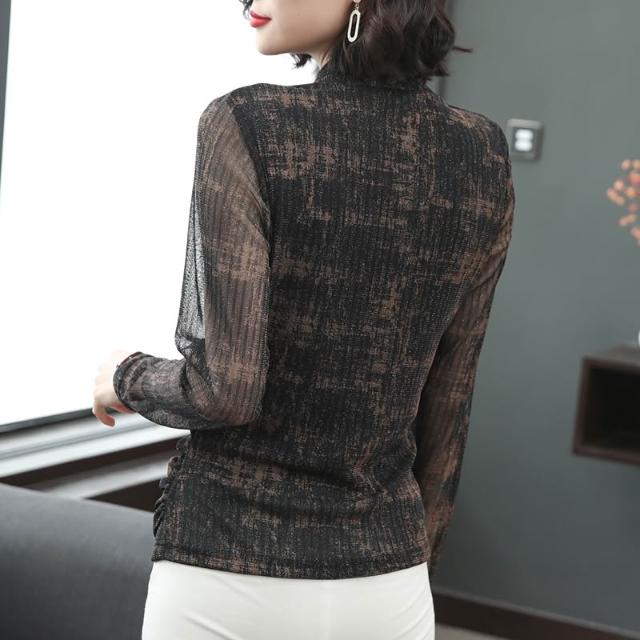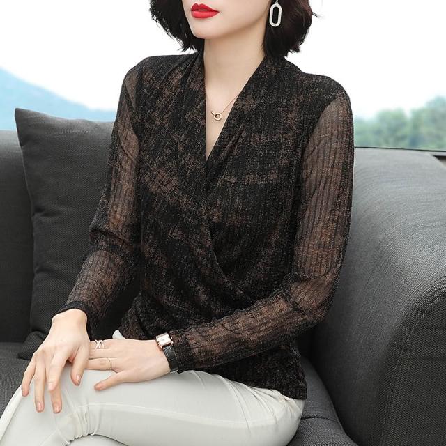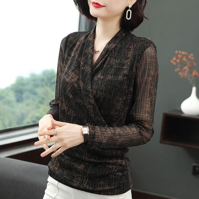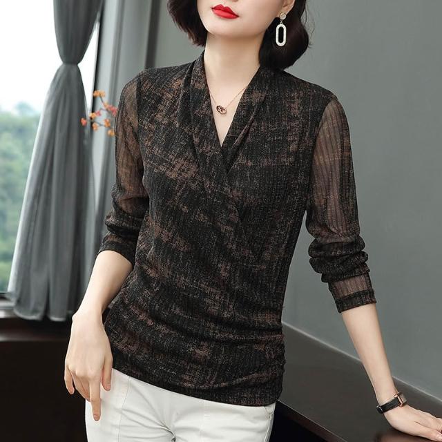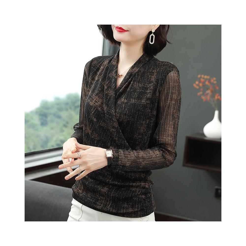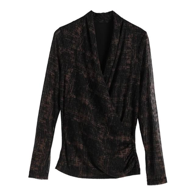 春夏新款 長袖T恤 上衣 春季新款廣場舞練習衫國標交誼舞蹈服長袖印花網紗交叉V領跳舞衫 初禾精品
