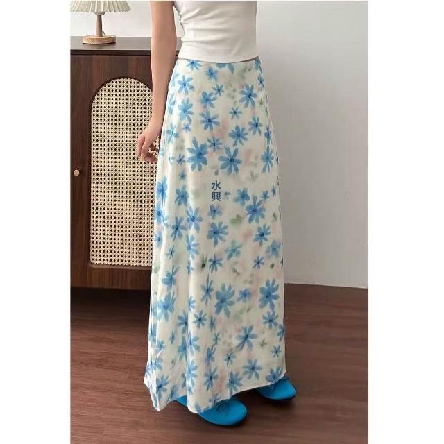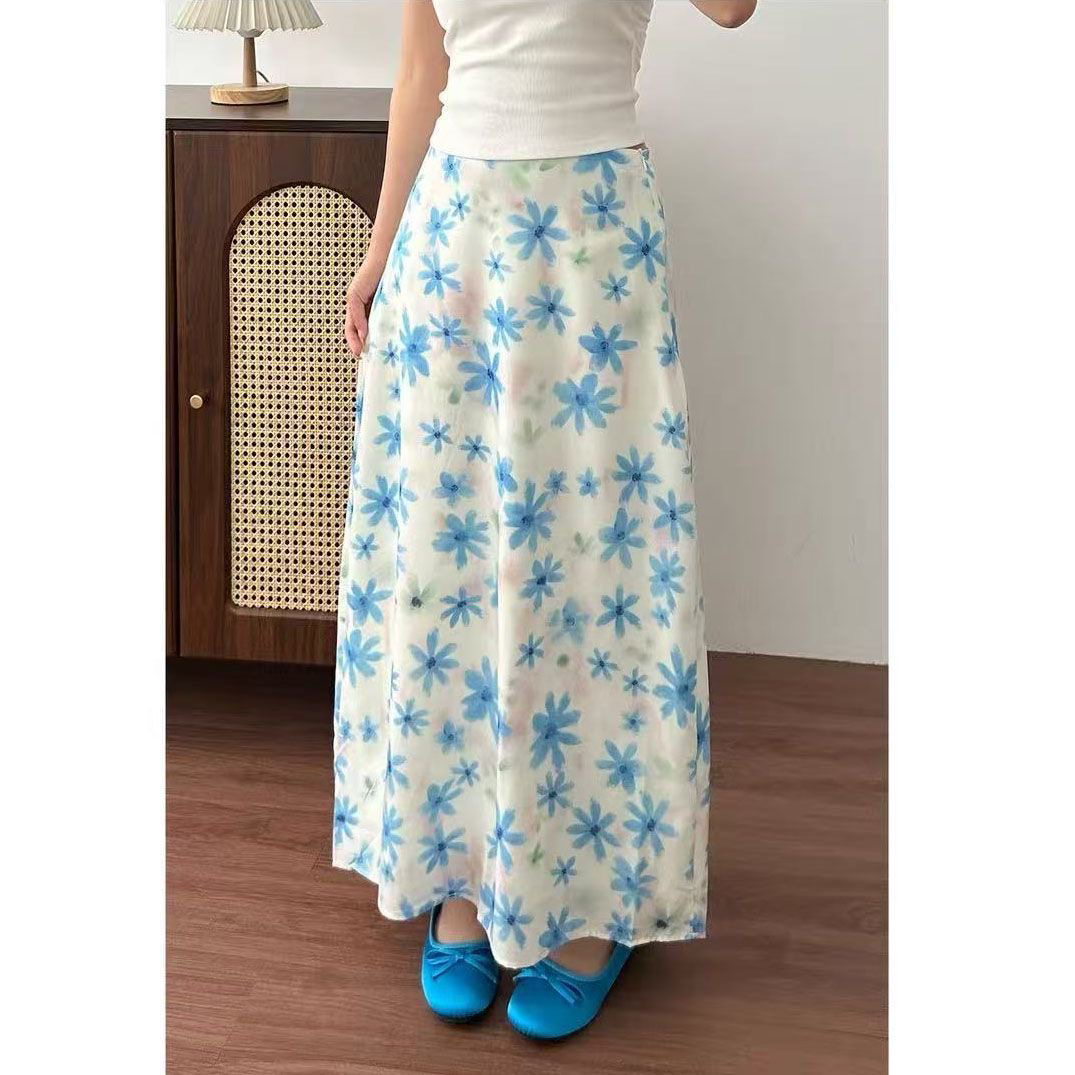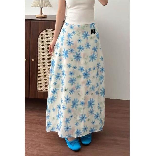 夏季新款 半身長裙 百搭簡約 大碼胖mm藍色碎花雪紡半身裙女夏季海邊度假風高腰網紗a字長裙子 初禾精品