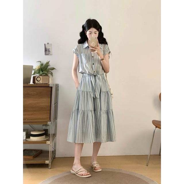 夏季新品 連衣裙 日常百搭 實拍~2026法式收腰顯瘦假兩件大碼連衣裙復古條紋設計感襯衫裙 初禾精品