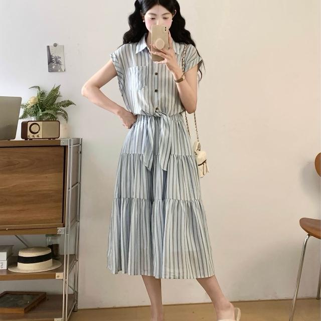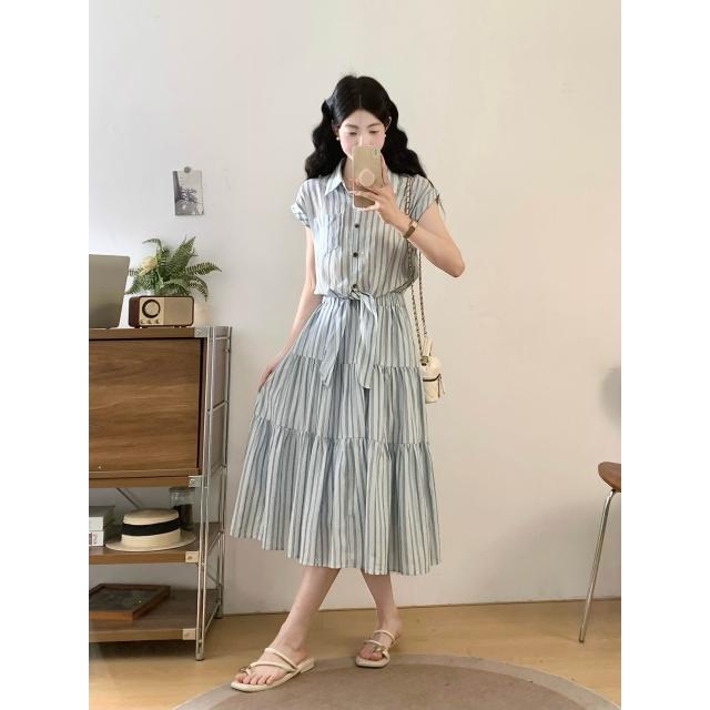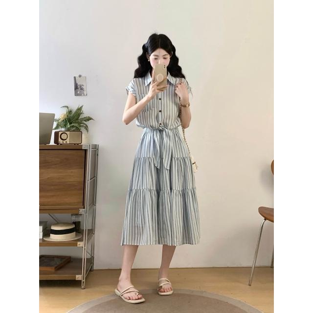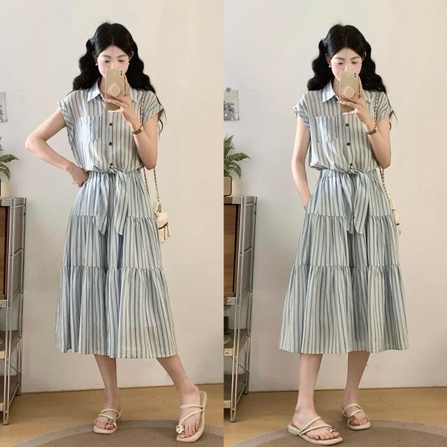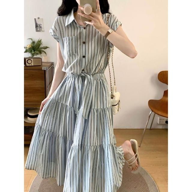 夏季新品 連衣裙 日常百搭 實拍~2026法式收腰顯瘦假兩件大碼連衣裙復古條紋設計感襯衫裙 初禾精品