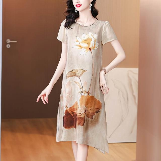 夏季新品 連衣裙 日常百搭 媽媽夏裝重磅國風真絲連衣裙洋氣大碼中老年女裝新款桑蠶絲長裙子 初禾精品