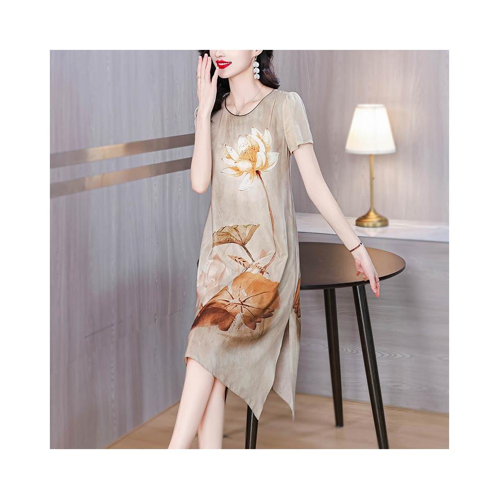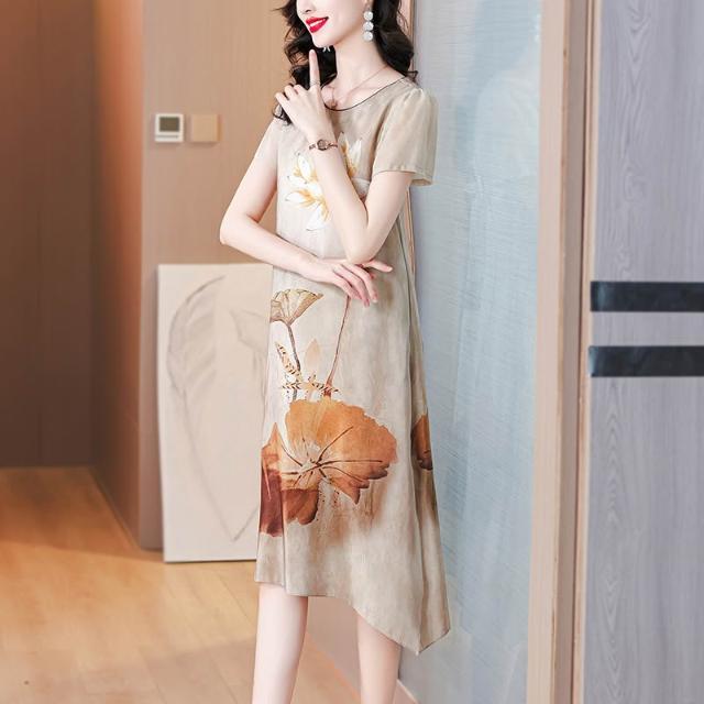 夏季新品 連衣裙 日常百搭 媽媽夏裝重磅國風真絲連衣裙洋氣大碼中老年女裝新款桑蠶絲長裙子 初禾精品