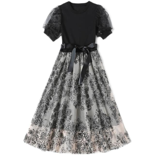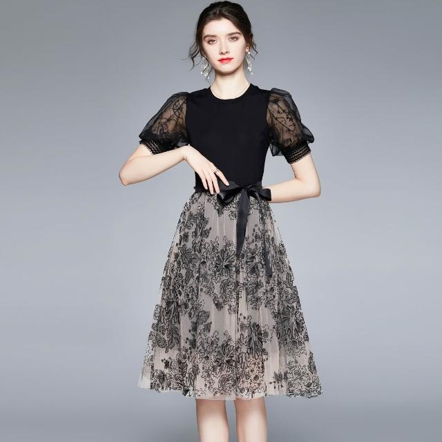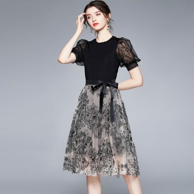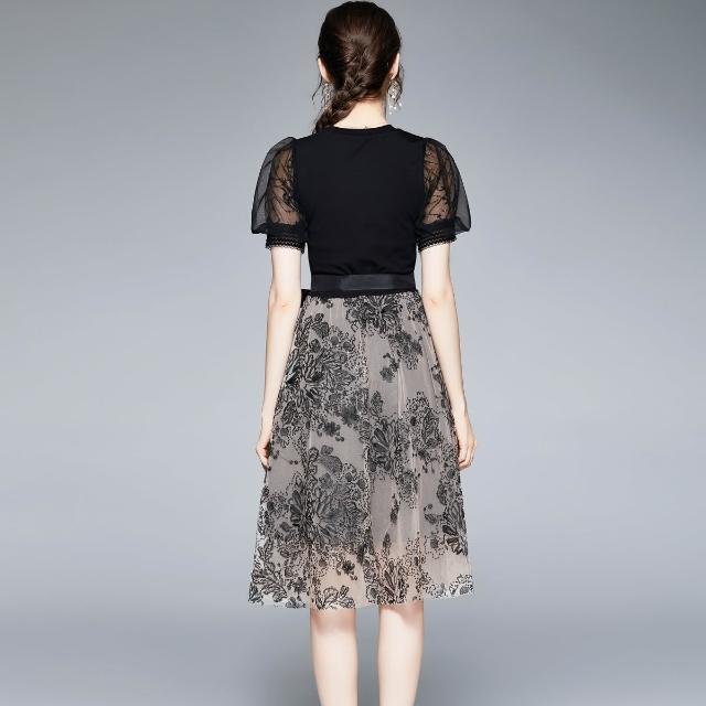 夏季新品 連衣裙 日常百搭 實拍2021年新款羅馬面料不起球拼接網紗中長款連衣裙 初禾精品