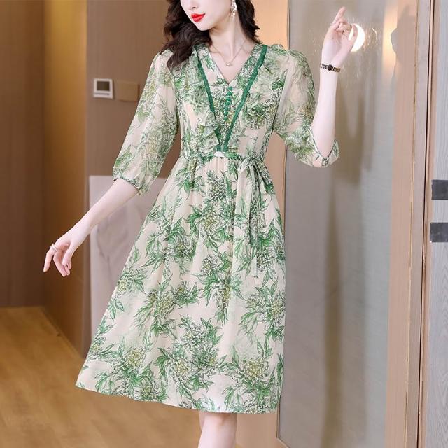 夏季新品 連衣裙 日常百搭 真絲連衣裙媽媽裝2023新款氣質高端遮肚子淡雅印花雪紡裙子中長裙 初禾精品