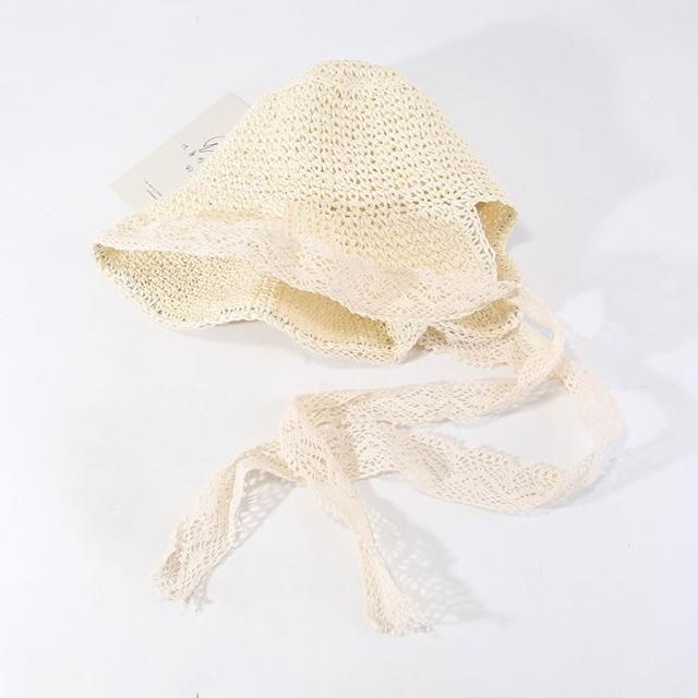 春夏新款帽子 百搭日常 帽子 法式蕾絲花邊遮陽草帽女夏季大帽檐飄帶漁夫帽海邊可折疊太陽帽子 初禾精品
