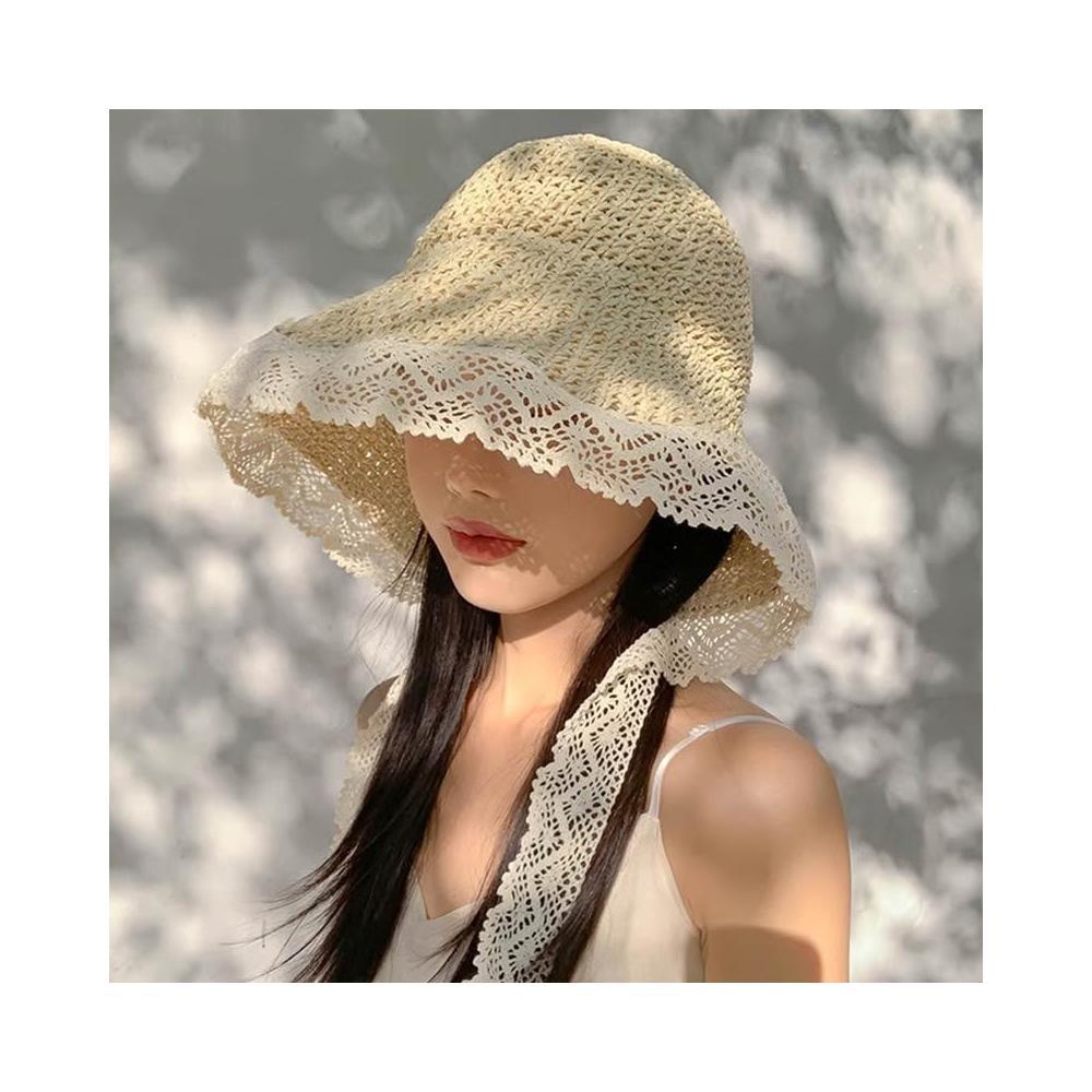 春夏新款帽子 百搭日常 帽子 法式蕾絲花邊遮陽草帽女夏季大帽檐飄帶漁夫帽海邊可折疊太陽帽子 初禾精品