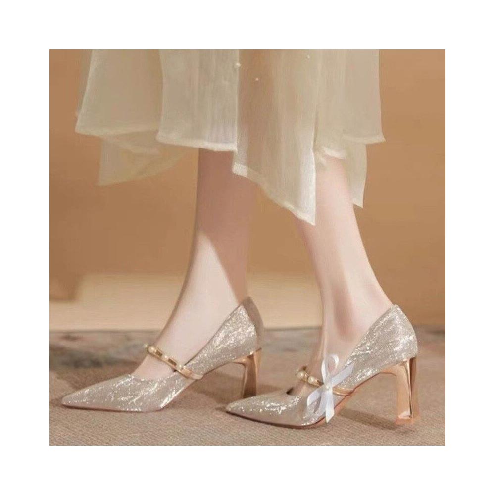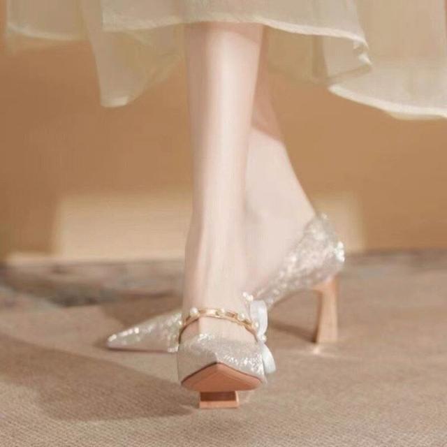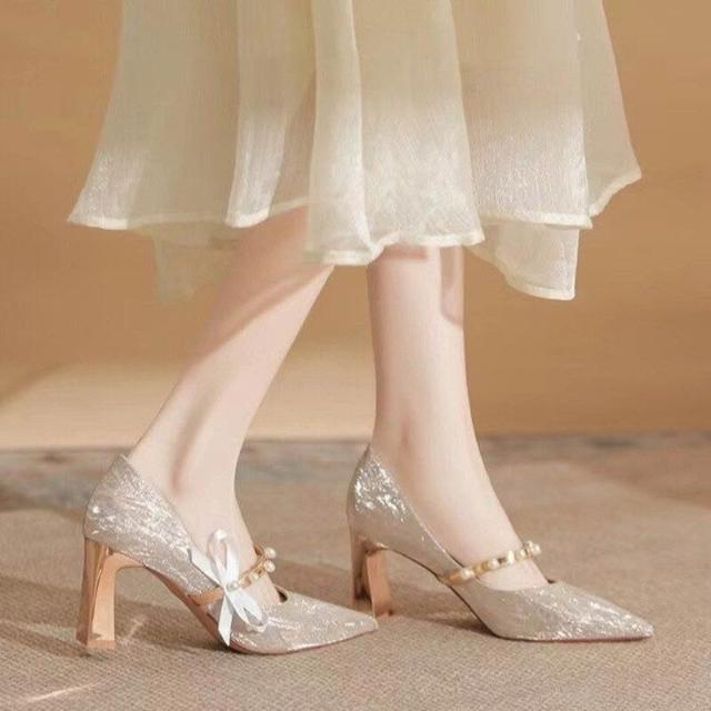 法式高跟鞋女不累腳粗跟婚鞋2025新款一字帶尖頭單鞋銀色香槟色 86