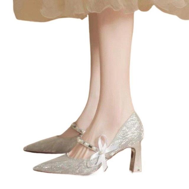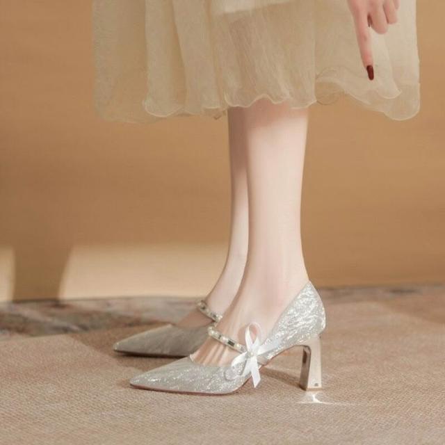 法式高跟鞋女不累腳粗跟婚鞋2025新款一字帶尖頭單鞋銀色香槟色 86