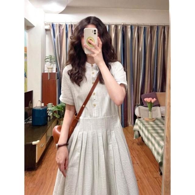 法式茶歇裙圓領排扣條紋短袖連衣裙女小個子壓褶設計中長款裙子 864