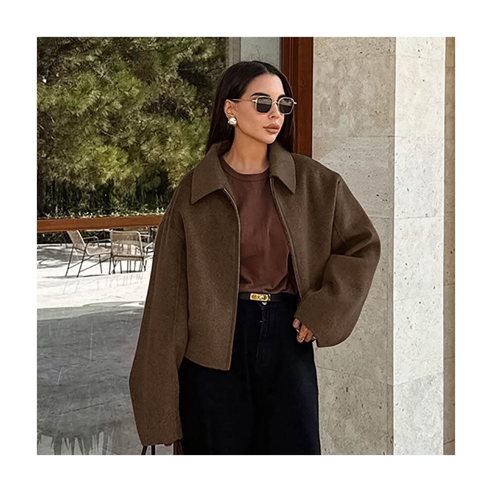 美拉德棕色毛呢外套女秋冬寬松女式夾克翻領厚款大衣女裝